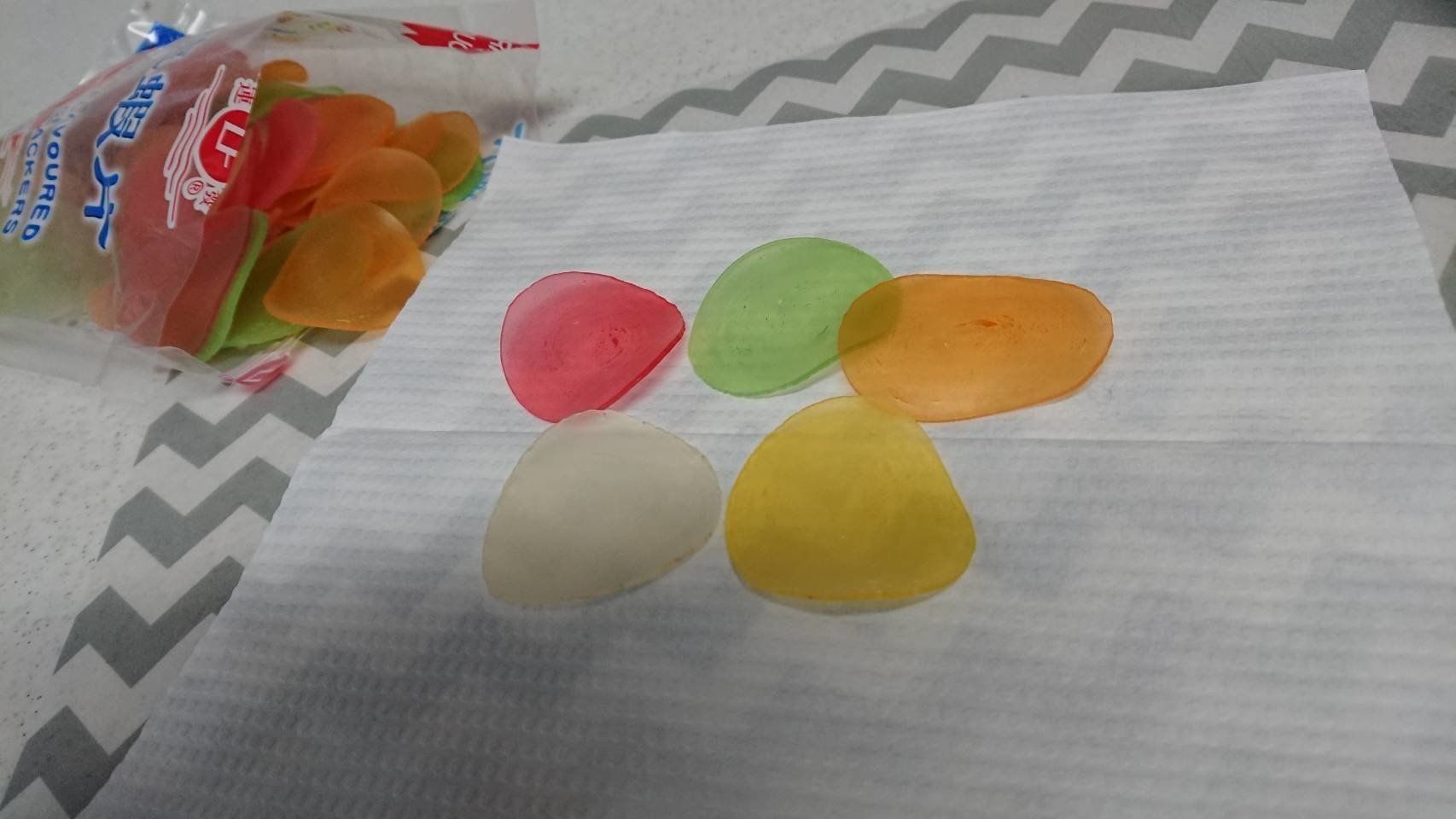ピンク・オレンジ・イエロー・グリーン・ホワイトの5色のえびせん入り!