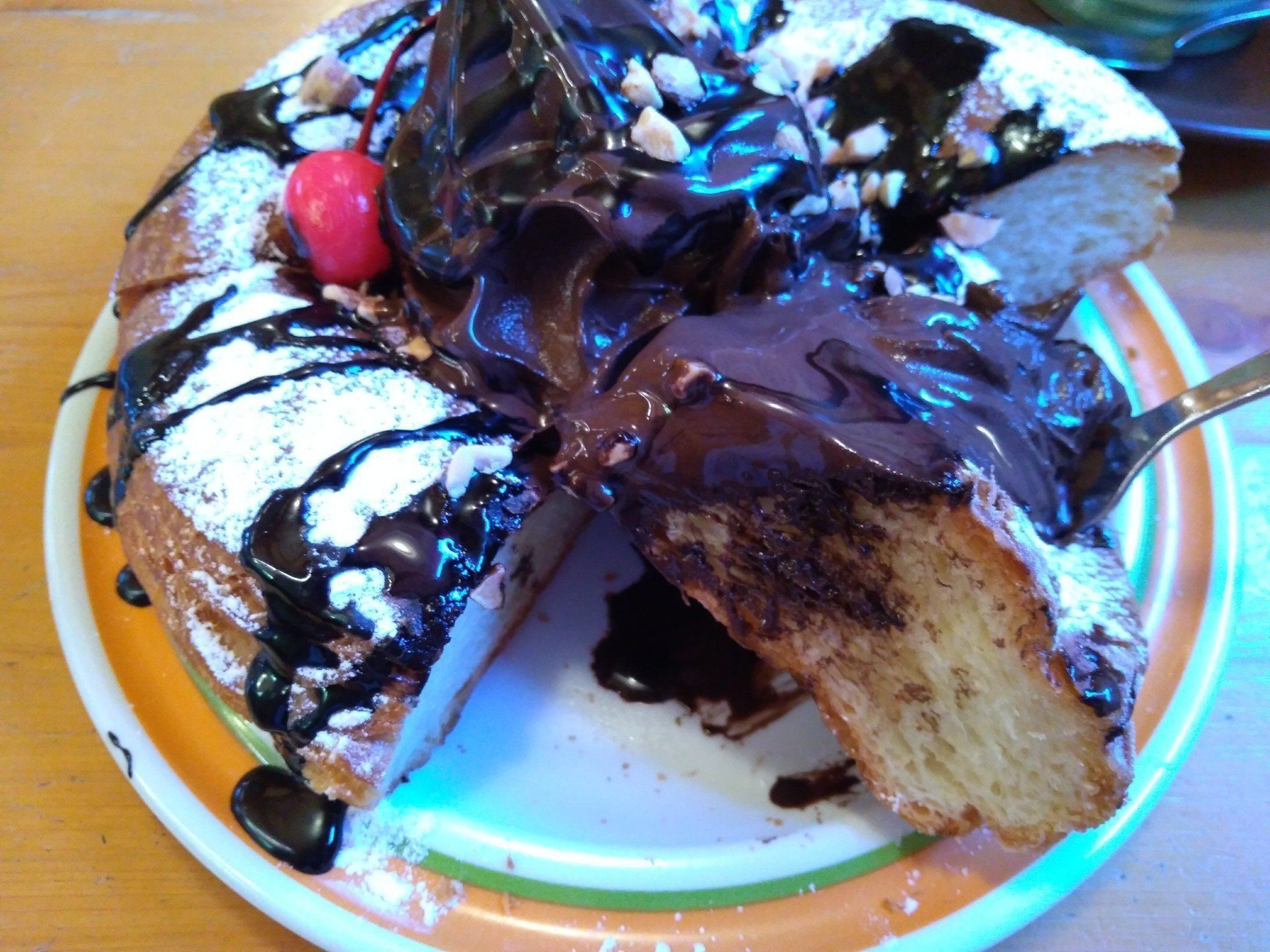 カカオが濃厚だという噂は聞いていたものの、運ばれてきた時点で、チョコレートソフトクリームがずっしり!デニッシュパンを押しつぶしていました。