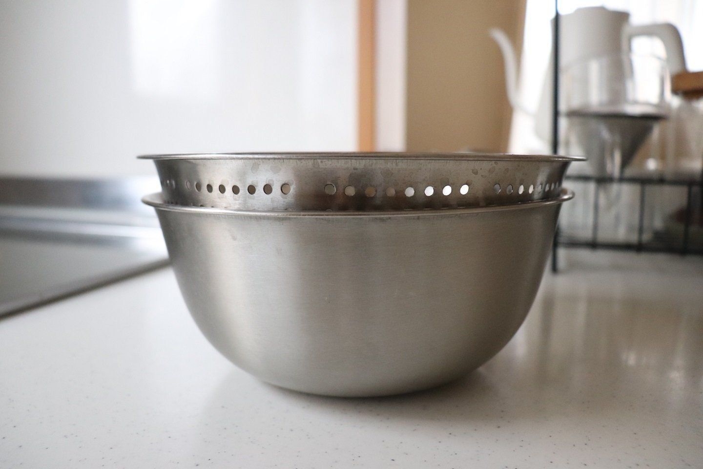 同じサイズのボウルと重ねて使うと、このようにボウルとザルの間に隙間ができるんです!これは高さのある足のおかげ。この隙間ができることによってこの隙間から水が流れ落ち、食材が溢れにくくなっています。