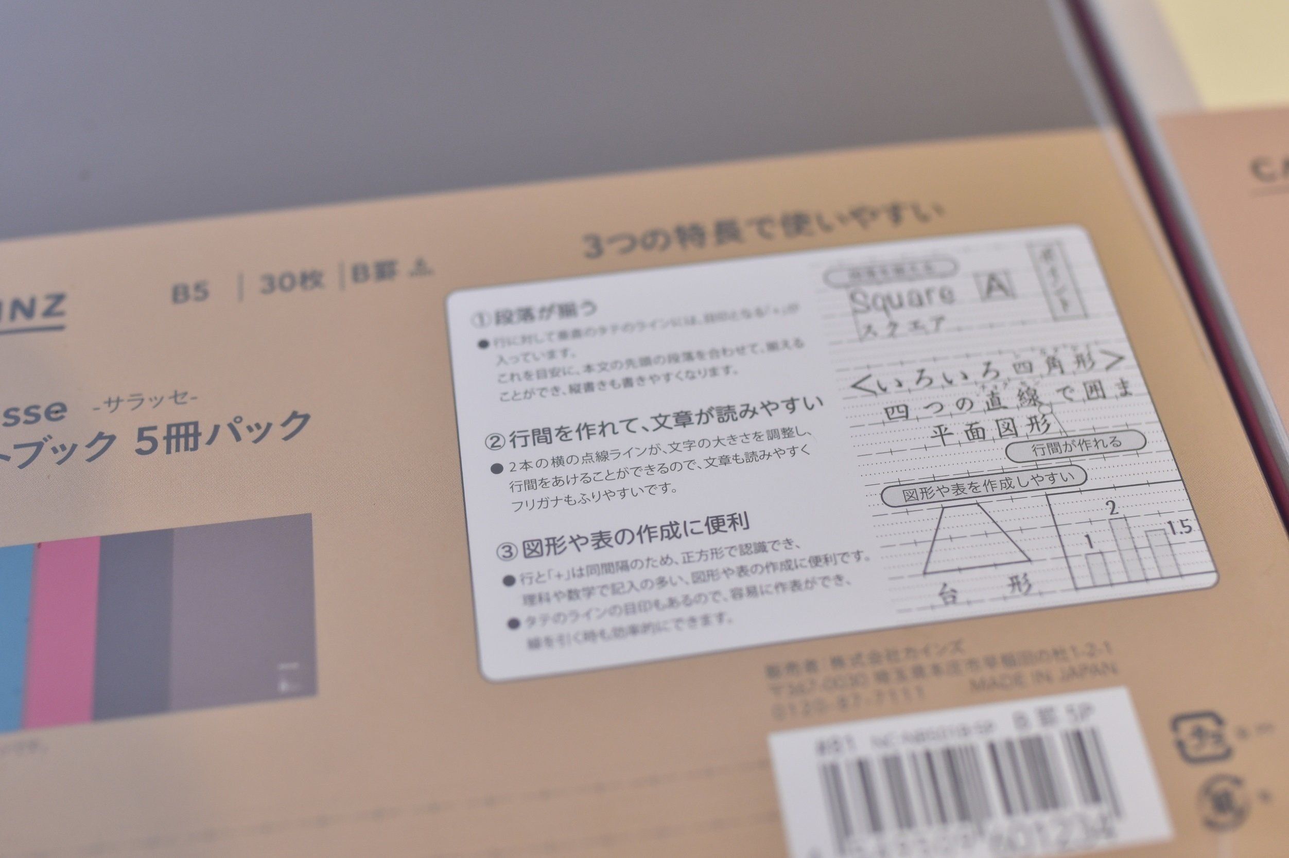 格安なのに、機能性抜群。図形が書きやすいように縦の目盛が入っていたり、フリガナが書けるように横に細かいラインが入っていたりします。