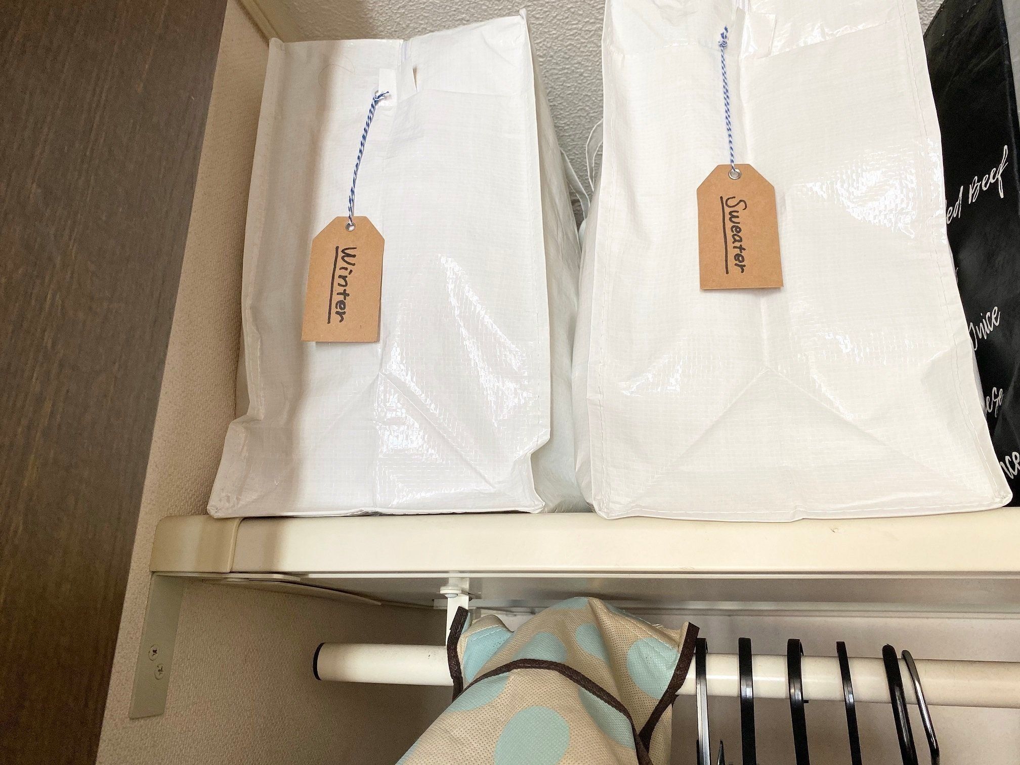衣替えのときにラベルを変えると気分も変わりますよ。ビニールバッグでのクローゼット収納のご紹介でした。