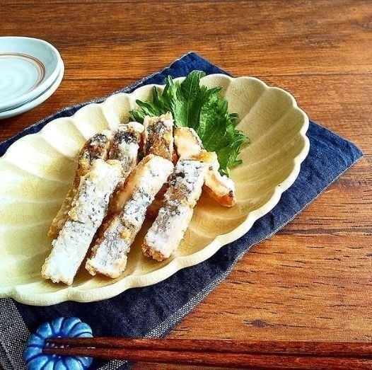 こちらはあじの竜田揚げ。あじを切り、しょうがや醤油などで味つけして揚げただけです。お魚の竜田揚げもたまにはよいですね。鯖でつくってもおいしいですよ。