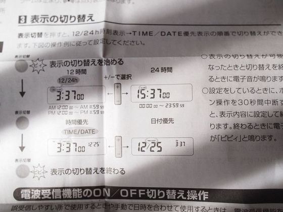 説明書とともに保証書もついています。ありがたいですね…表示の切り替えの方法など、詳しく説明書に載っており、簡単に切り替えることができるので安心です。また時間優先モードと日付優先モードがあり、どちらかといえば日付が知りたいという方のためにも表示の切り替えが簡単にできるようになっていて便利です。
