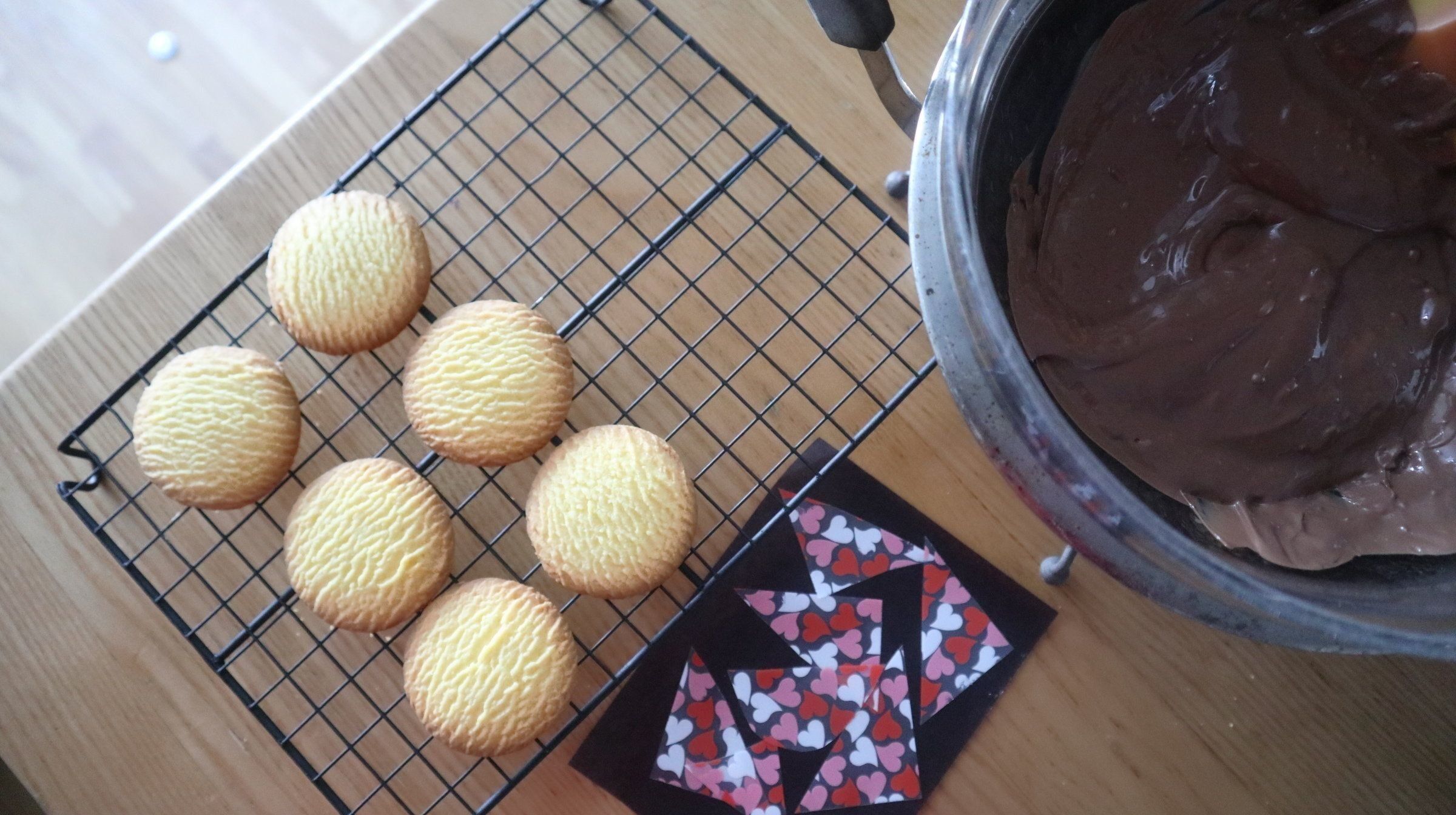 転写したいお菓子に湯せんで溶かしたチョコレートをぬり、転写シートを貼りつけます。