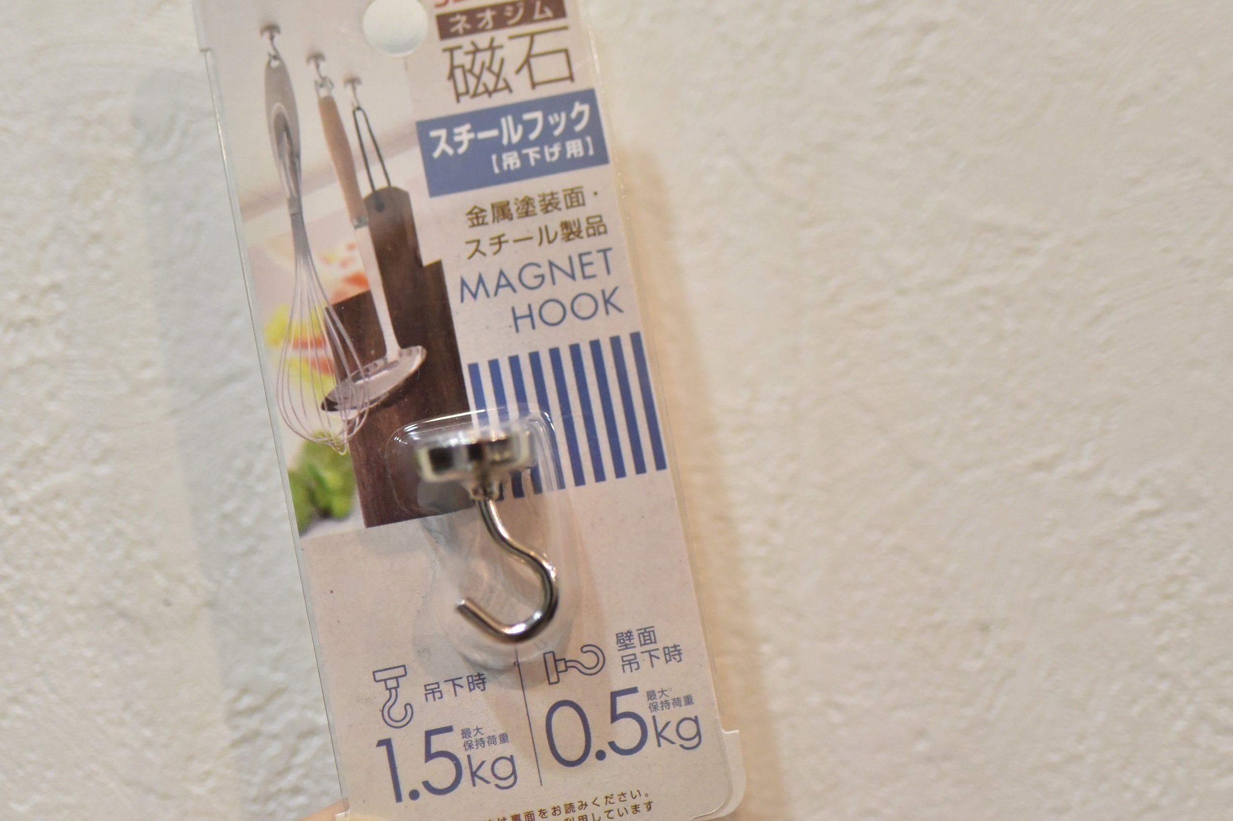 マグネットというと壁に貼りつけるというイメージがありますが、100円均一のお店で販売されているマグネットフックのなかには、吊り下げるタイプの商品もあります。