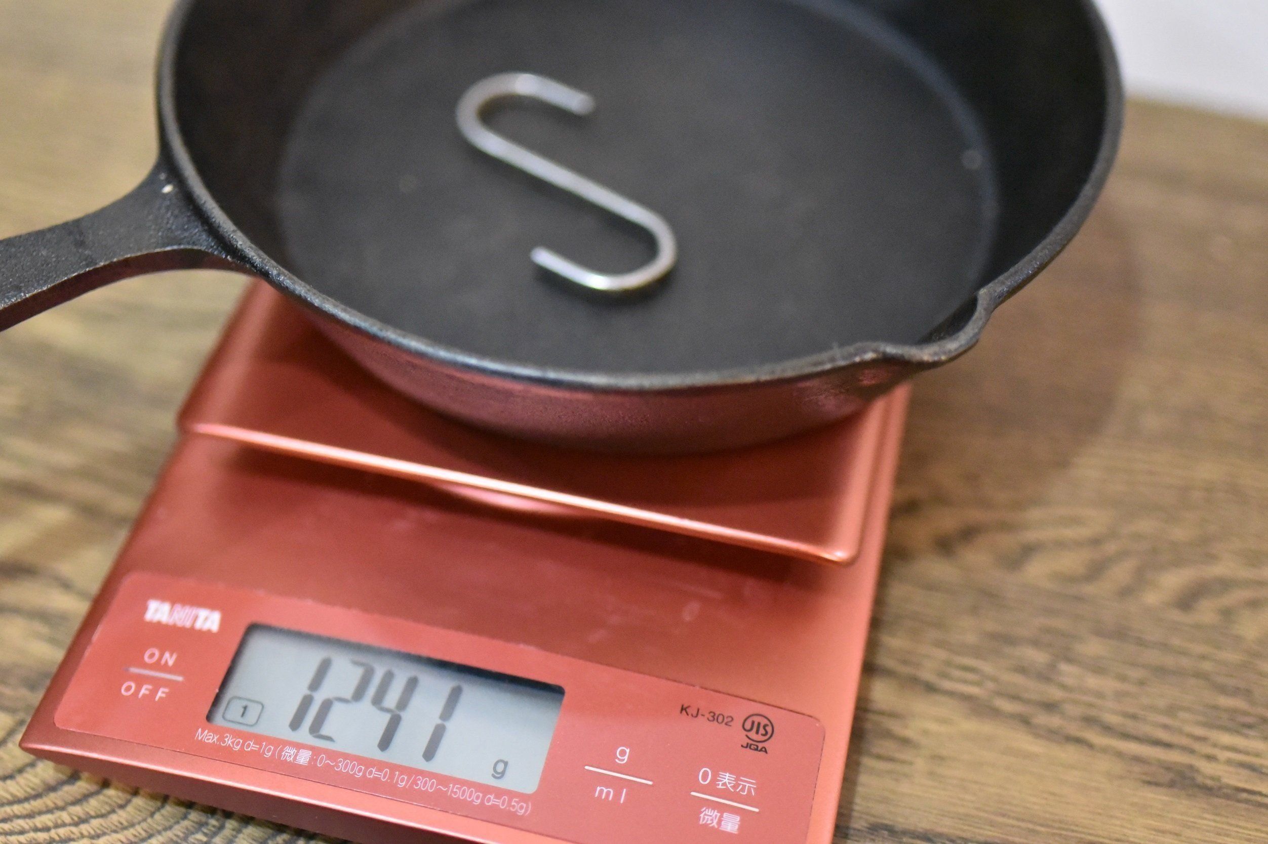 スキレットとS字フックの合計1.24kgを吊り下げてみると、