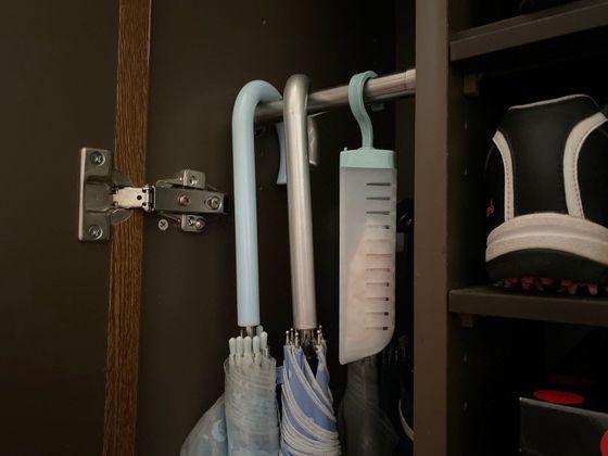 フックがついているのでクローゼットのラックなどに適していますが、写真のように玄関にも使えます。シューズクローゼットの傘の横に置くと有効な湿気対策になりそう!細長い形状なので横にして、靴と靴の隙間に入れたりもできます。