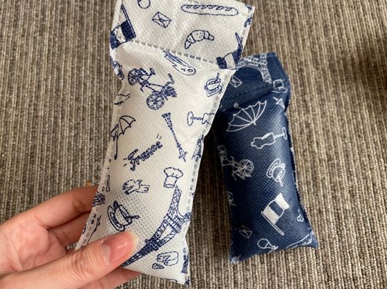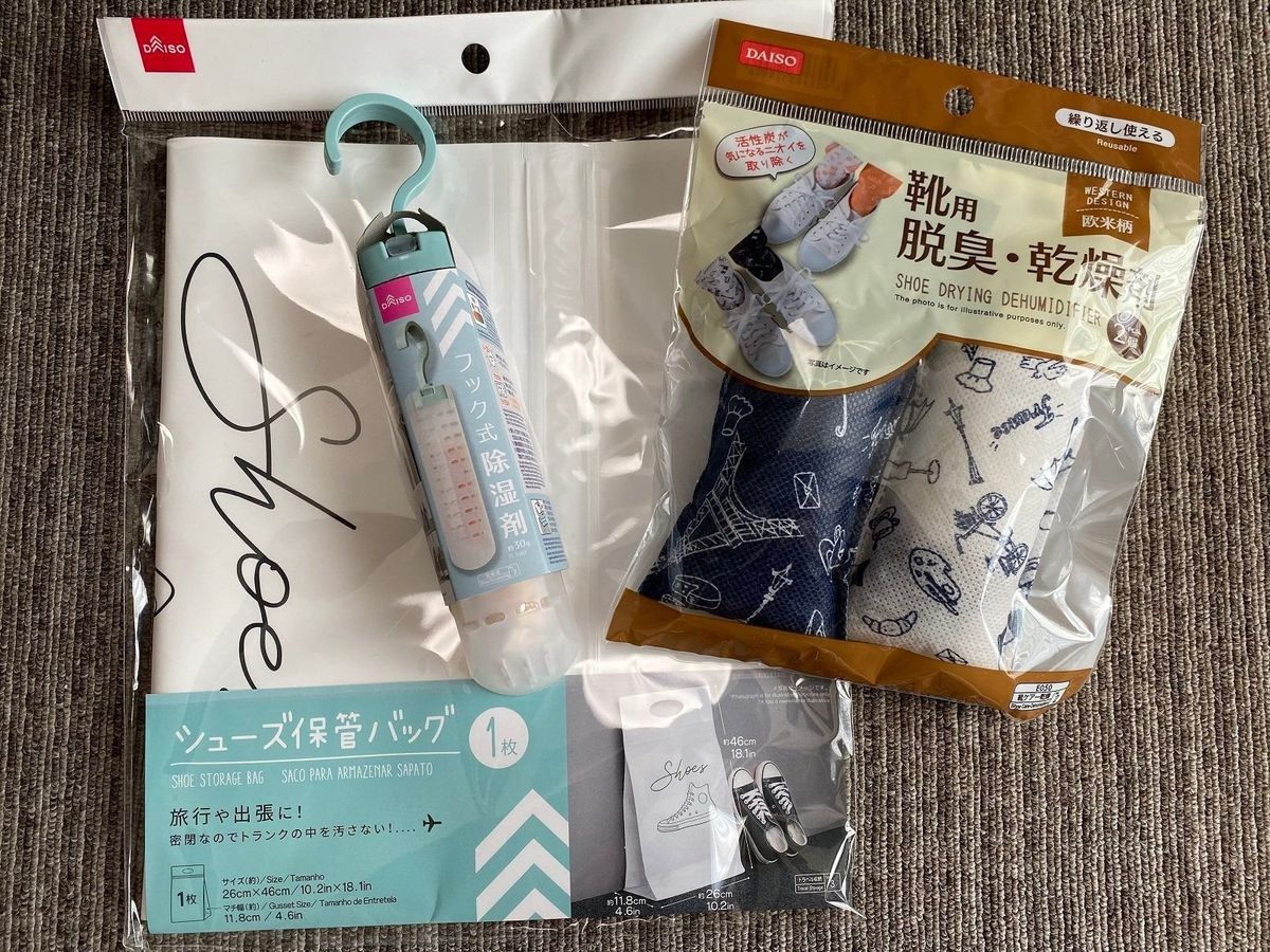 暖かくなると、靴にこもった湿気が気になりますよね。そんなときに使いたいのが、「靴用脱臭・乾燥剤」。白と紺の、プリント柄がかわいい乾燥剤が2個(靴1組分)入っていて、価格は100円。