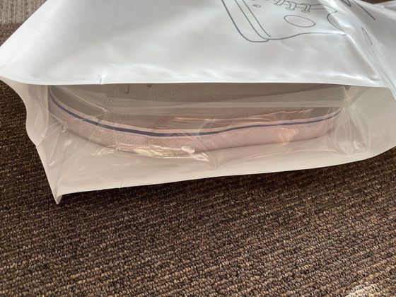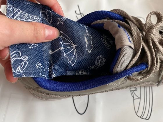 最初に紹介するのは「シューズ保管バッグ」(価格100円)。サイズは約46×26×11.8cmで、白地にスニーカーイラストがかわいいですね。そしてこのバッグ、側面がすごいんです。