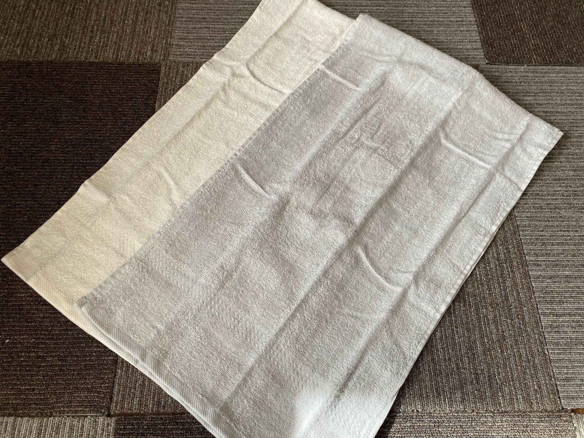 画像は、ニトリのスリムバスタオル(白)と一般的なフェイスタオル(モカ色)と比べたところです。個人的には大きすぎず、小さすぎずのちょうどいいサイズ感と思います。