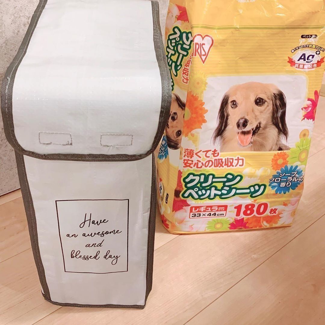 オムツの袋は、デザインがカラフルでそのまま置くと生活感が丸出しに。キャンドゥのモノトーンのおむつカバーを使えば、すっぽり被せるだけでおしゃれな空間に。オムツだけでなく、サイズによってはペットシーツも目隠しできちゃいます!