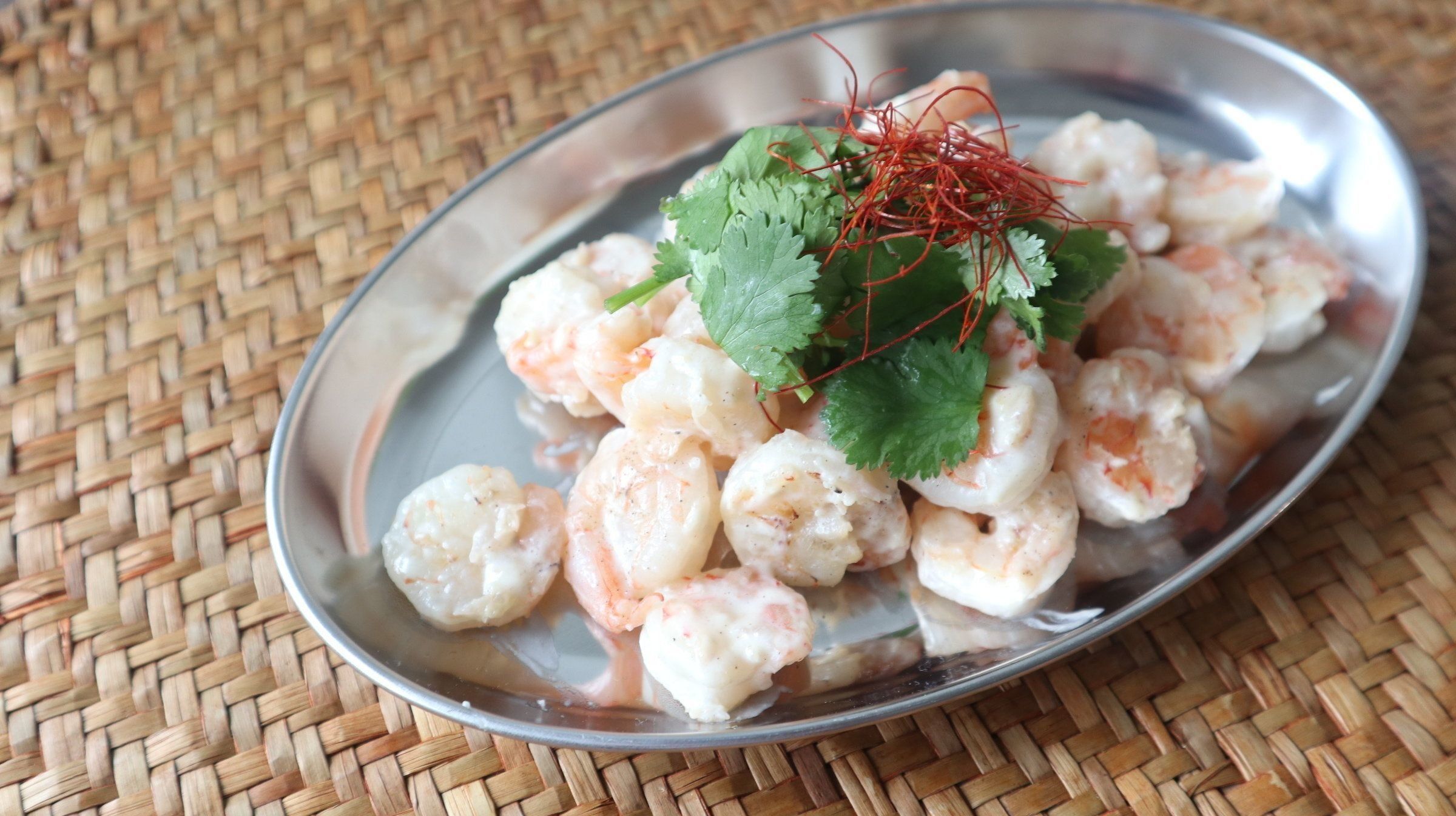 まずは、「海老のココナッツ炒め」。フライパンにごま油、すりおろしにんにく、すりおろししょうが、海老を入れて炒め、火が通ったらココナッツミルク、ナンプラー加えて炒めたら完成。最後に、パクチーと糸唐辛子をトッピング。