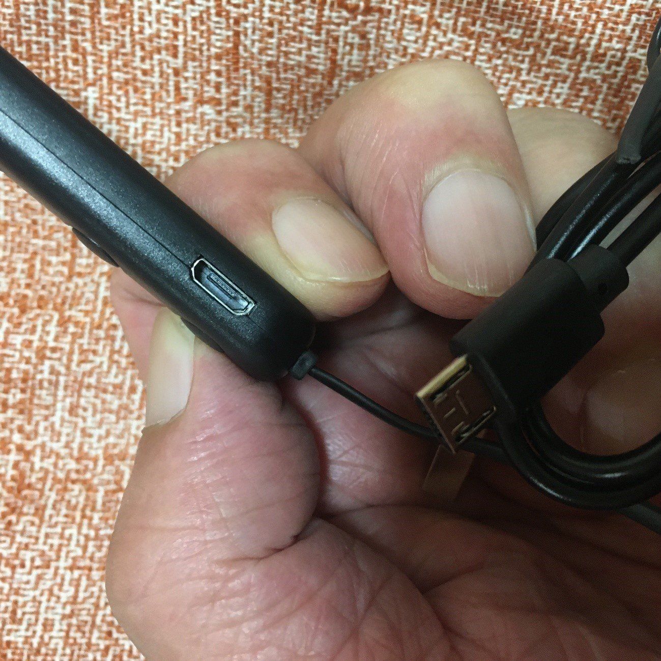充電されていないので、最初に充電が必要です。1~2時間ケーブルにつないで充電してください。充電ケーブルはUSBなので、スマホの充電器が使えます。