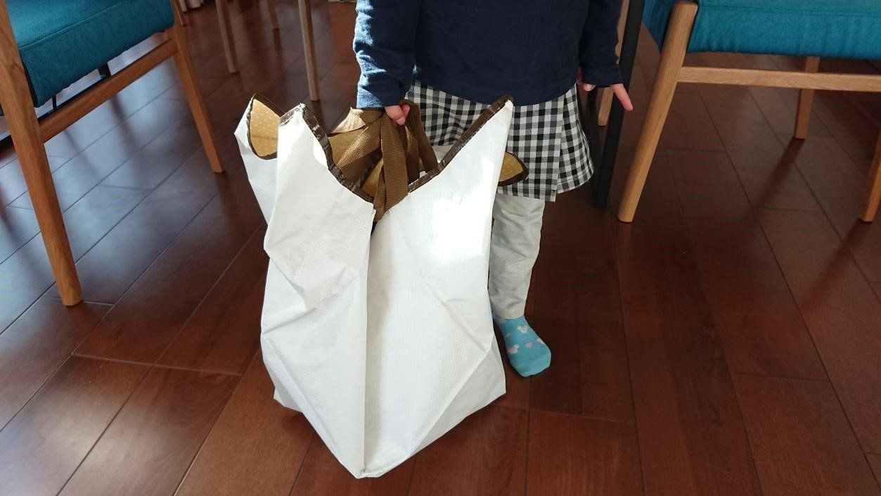 ボタンで留めて立ち上げた4隅には、写真のように持ち手の紐がついています。これを合わせて持ち上げれば、シートが手提げ袋のような形状に!