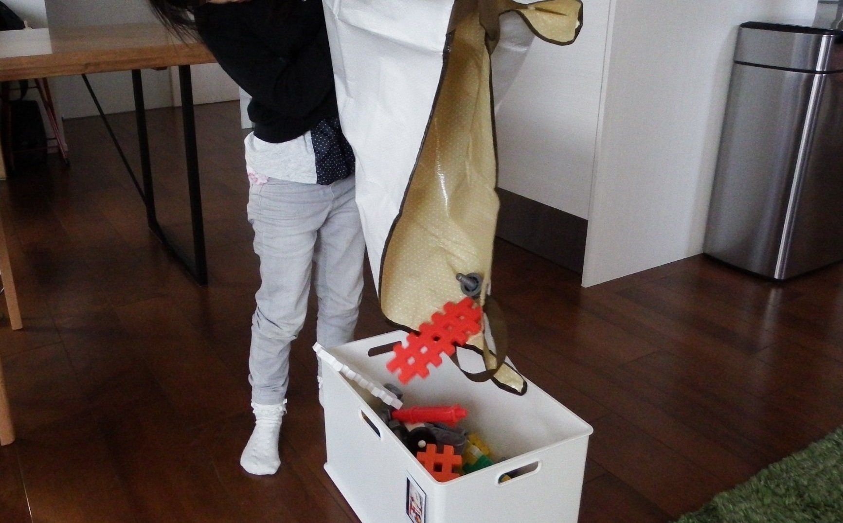 遊ぶ場所の変更はもちろん、ざっくりとまとめることができるので、あっという間にスペースが片づきます。箱にこのまま入れて中身をスライドすると簡単に片づけることもできます。中身が大量のときは大人といっしょに行う方がおすすめです。