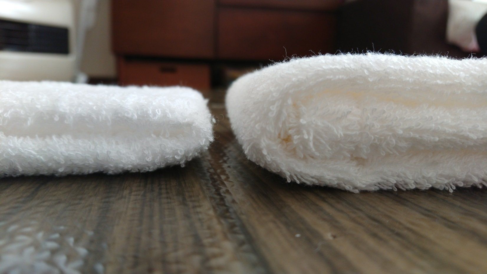 「ふんわり吸水フェイスタオル」のよさを視覚的に理解していただくために、同じダイソーの100円フェイスタオルと比較してみました。その違いは、一目瞭然。ふんわり感たっぷりで、畳んだときに厚みがあって、高級感があります。