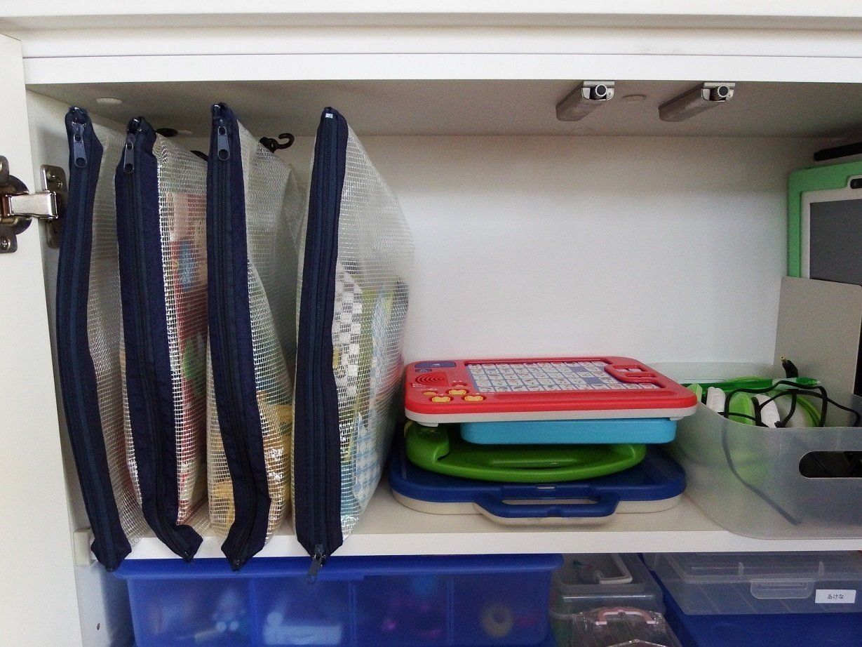 取り入れてみた場所はこちら。形状もバラバラで、自立も難しく、ついつい雑に平置きになりやすい教育教材。写真のように重なっていると、とても取りづらいですよね。