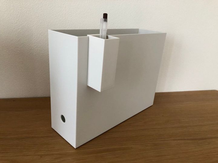 さらに、書類とペンをセットにしておけばより使いやすさがアップ!無印良品の「ポリプロピレンファイルボックス用・ペンポケット」(150円・税込)は、今回紹介したファイルボックスにジャストフィット。40×40×100mmとコンパクトですが、ペンが数本入ります。