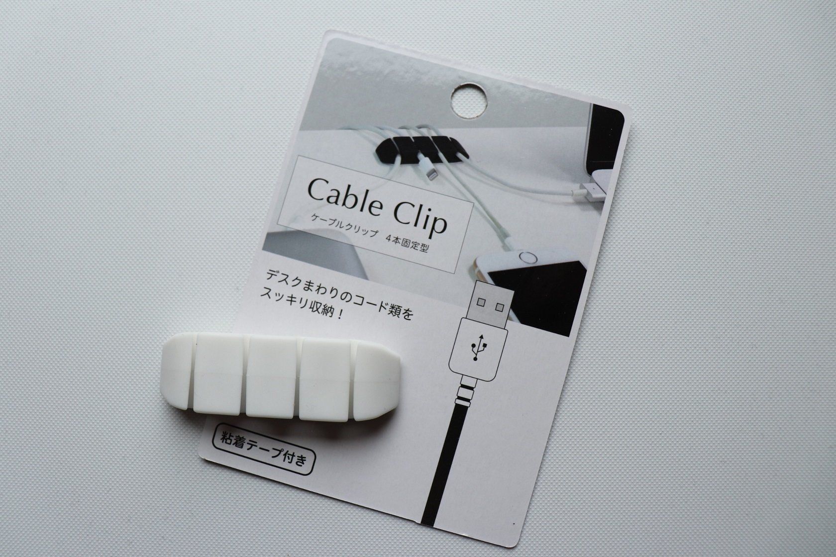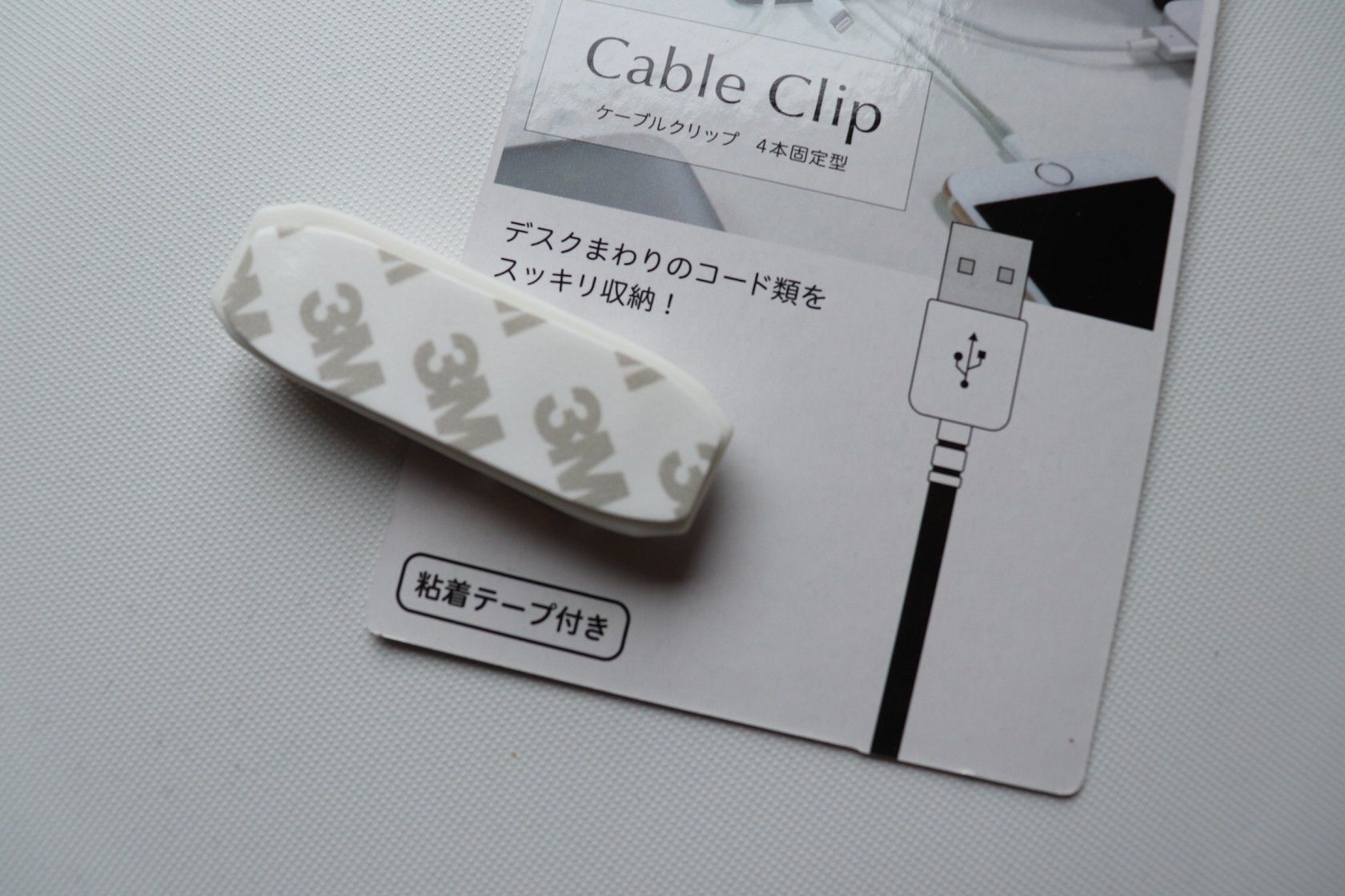 クリップ本体の底面には粘着テープつき。机に固定して貼ればケーブルがごちゃついて絡まるのを防いでくれます。