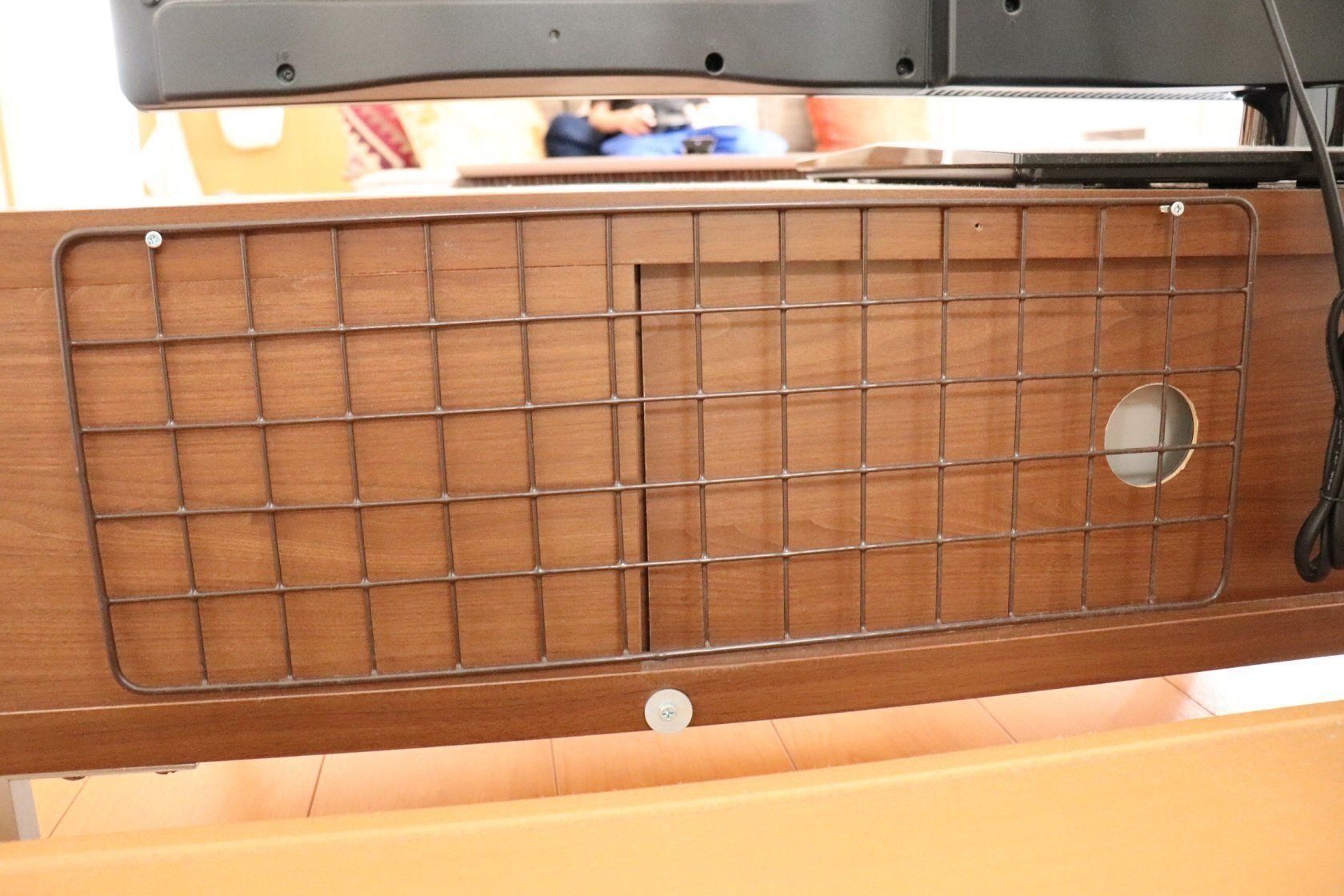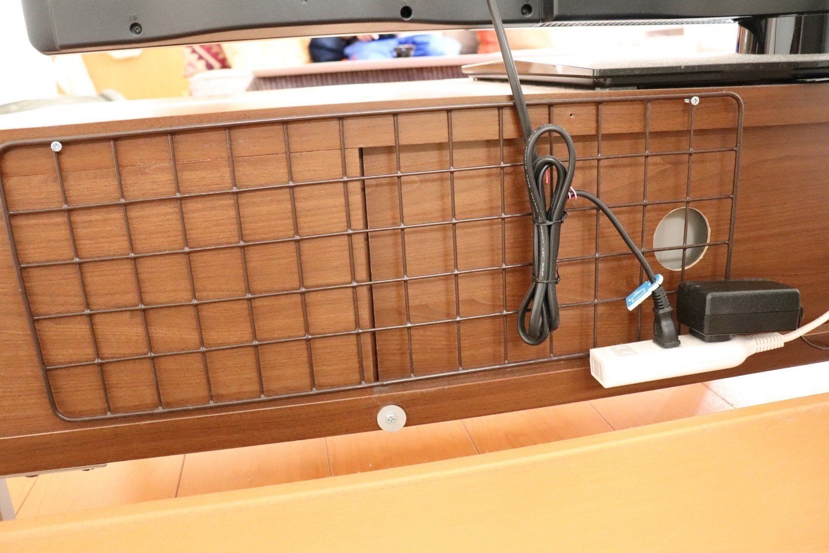 こちらのよく見る「ワイヤーラティス」もケーブルをすっきりさせるのに一役買ってくれます。テレビボードのサイズにあったワイヤーラティスを、ボードの後ろ側にネジや画鋲で止めればケーブルフックの完成。