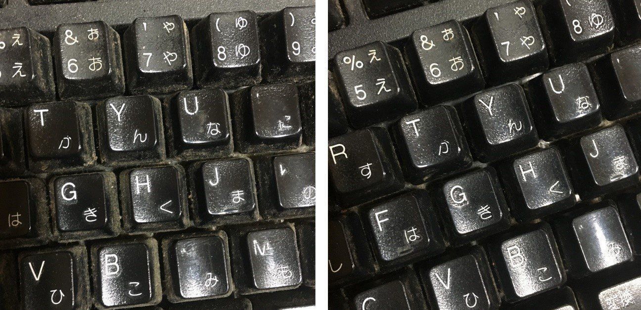 写真は実際にキーボードに「ジェルクリーナー」を使ってみた際のビフォー・アフター。左がビフォーで、右がアフターです。