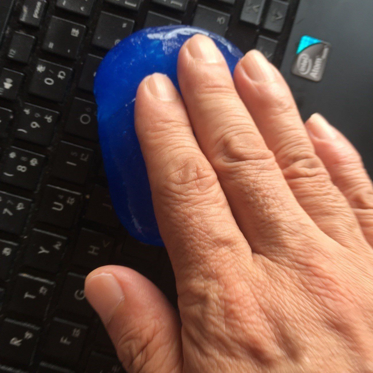 まずは、手元にあったパソコンのキーボードとリモコンをお掃除してみました。使い方は極めて簡単。掃除したい場所の上にジェルを置いたら、隙間にジェルクリーナーが入りこむように、少し押しつけてグリグリするだけ。