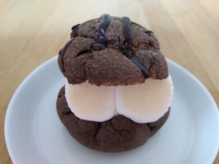 公式ホームページによると、「スライスしたココアシューに、チョコカスタードとオレンジソース、ホイップクリームを絞り、焦げ目のついたマシュマロをはさんだ」とのこと。