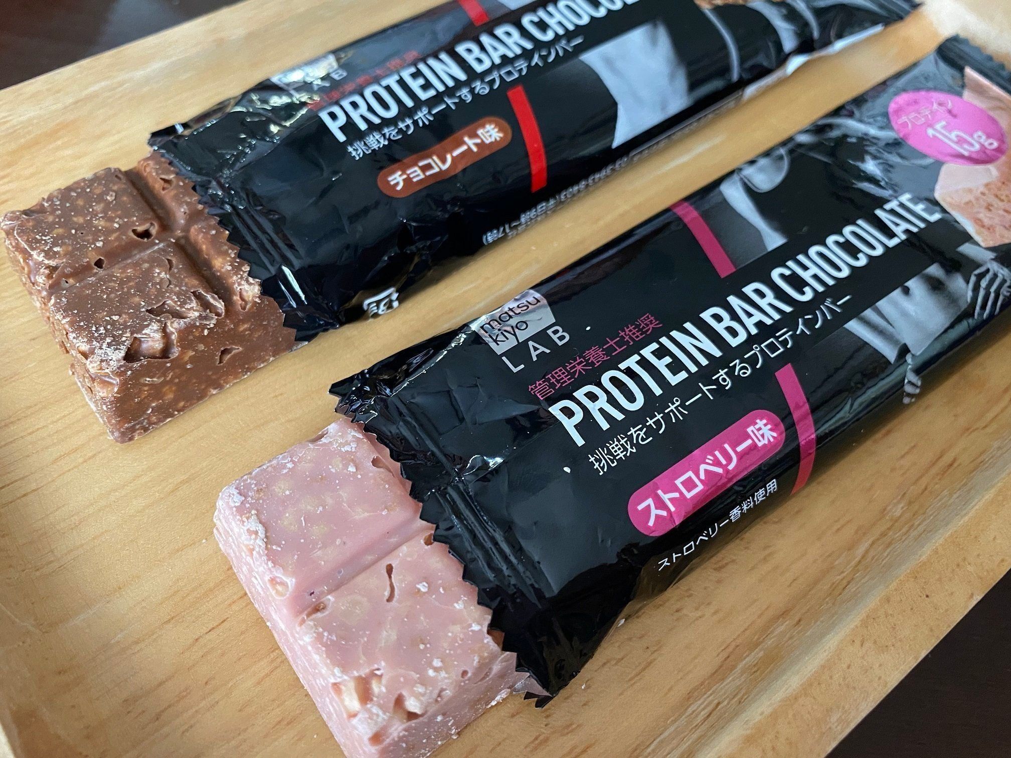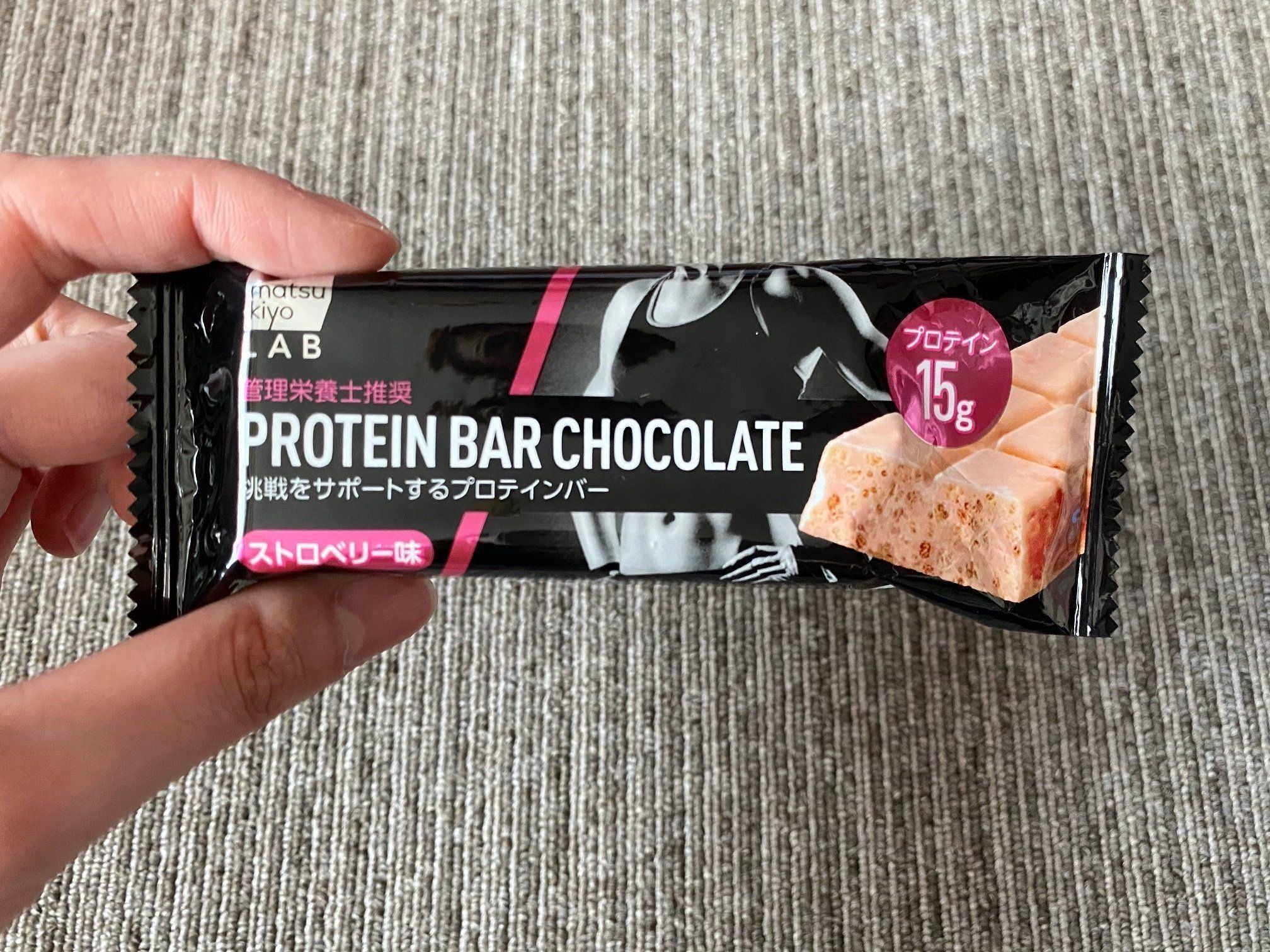 運動をする際には、プロテインも摂取したいところ。タンパク質を手軽に摂るならプロテインバーがおすすめ!マツモトキヨシのPBには、その名も「PROTEIN BAR CHOCOLATE」という商品があります。フレーバーはストロベリー味とチョコレート味の2種類で、価格は各128円。
