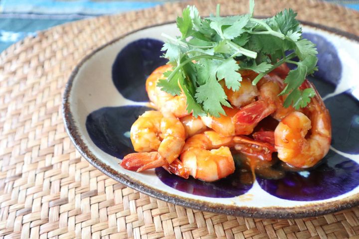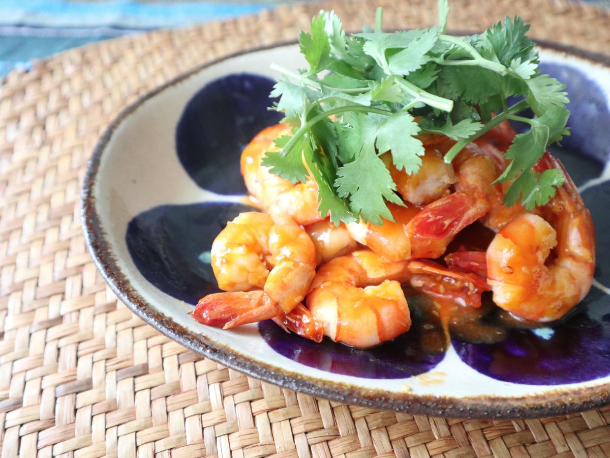 お好みでパクチーをのせれば、海老のタイ風炒め完成です。