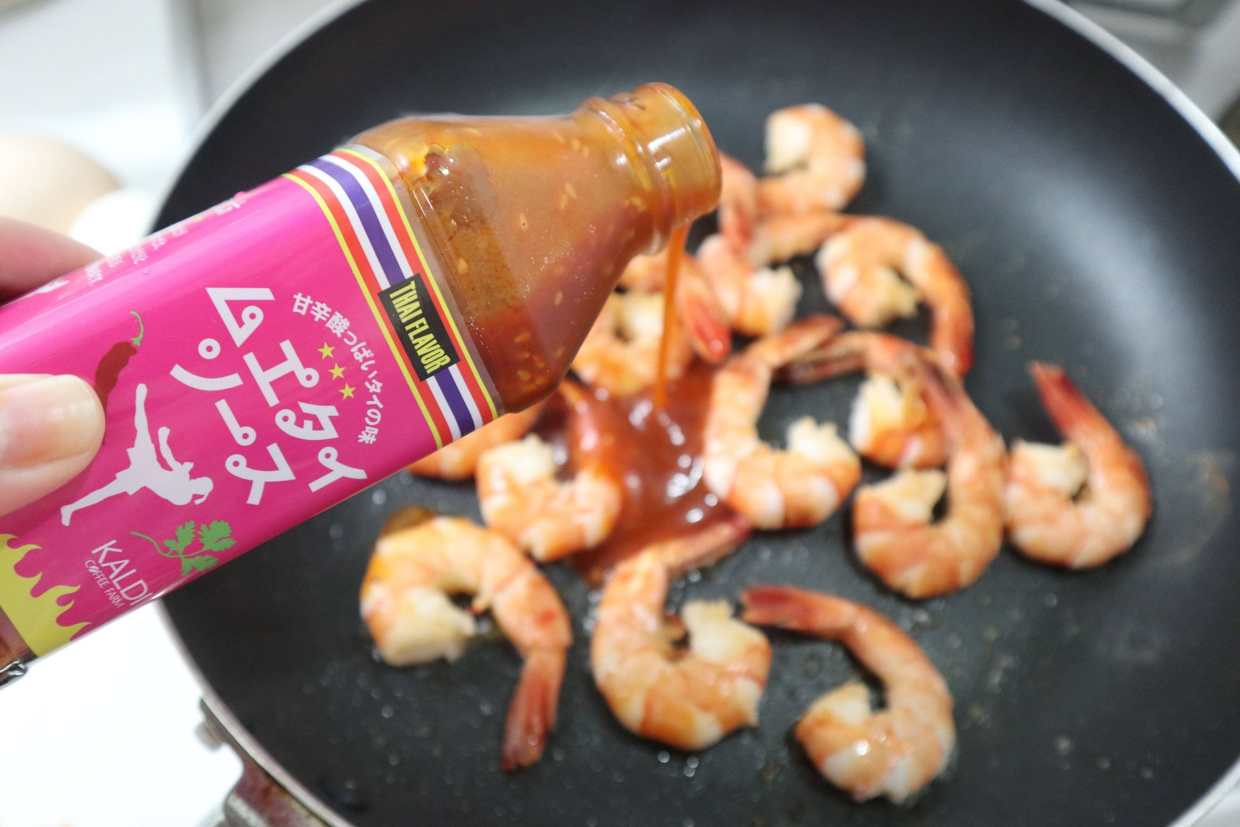 フライパンにごま油をしいて、下処理をしたエビを入れて炒め、火が通ったらムエタイソースを加えてからめたら完成です。これだけで味が決まると時短になりますよね。