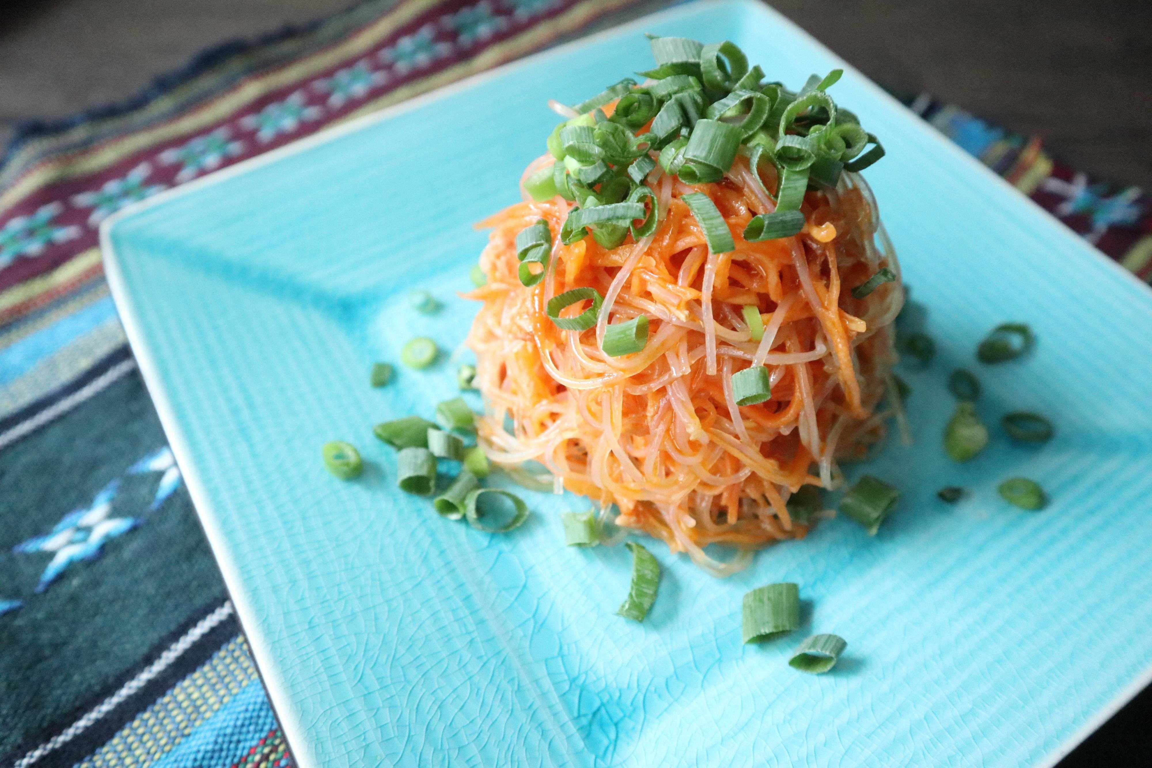 写真は、春雨、千切りして塩もみして絞ったにんじん、ツナ缶が具材です。