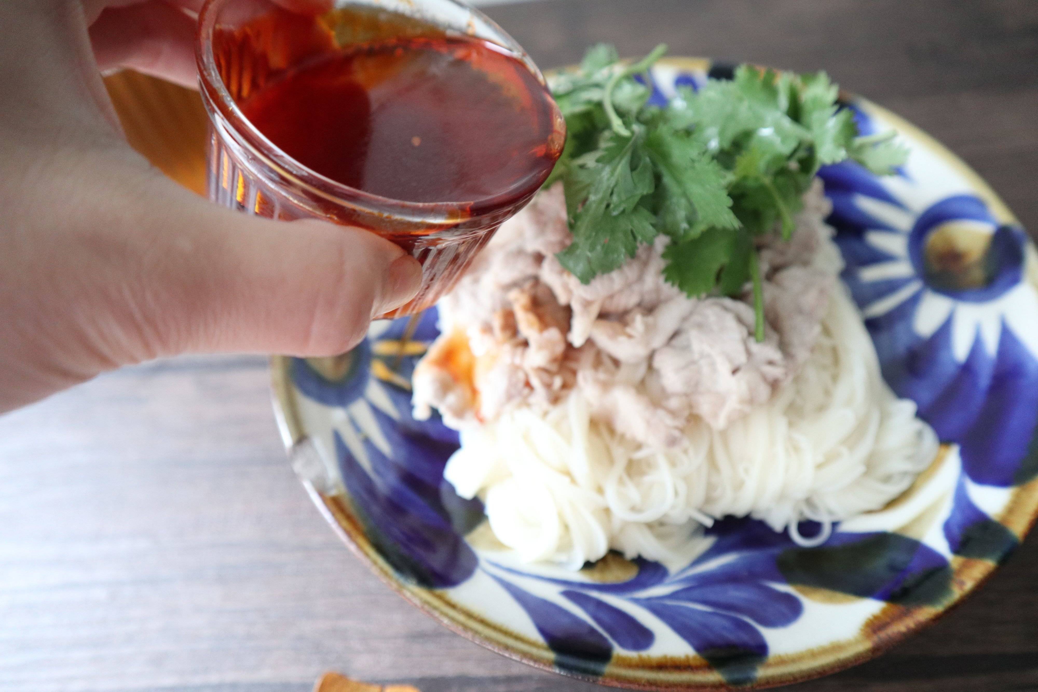 ムエタイソースとめんつゆを1:3の割合で混ぜたら、即アジアンなつけダレに!