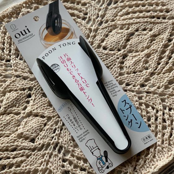 片面がスプーン状に、片面がスリット入りになっており、どちらを下側にして挟むかでさまざまな使い方ができちゃうトングです。例えば、ゆで卵やお豆腐料理など傷がつきやすかったり、掴みづらいものはスプーンを下側に、オリーブやツナ缶など、汁気を帯びたものは、スリットを下側にするとザルなどに出して水切りする手間がなくって便利!耐熱温度も約140度までOKと書かれているので、鍋やフライパンとの相性もばっちりです!