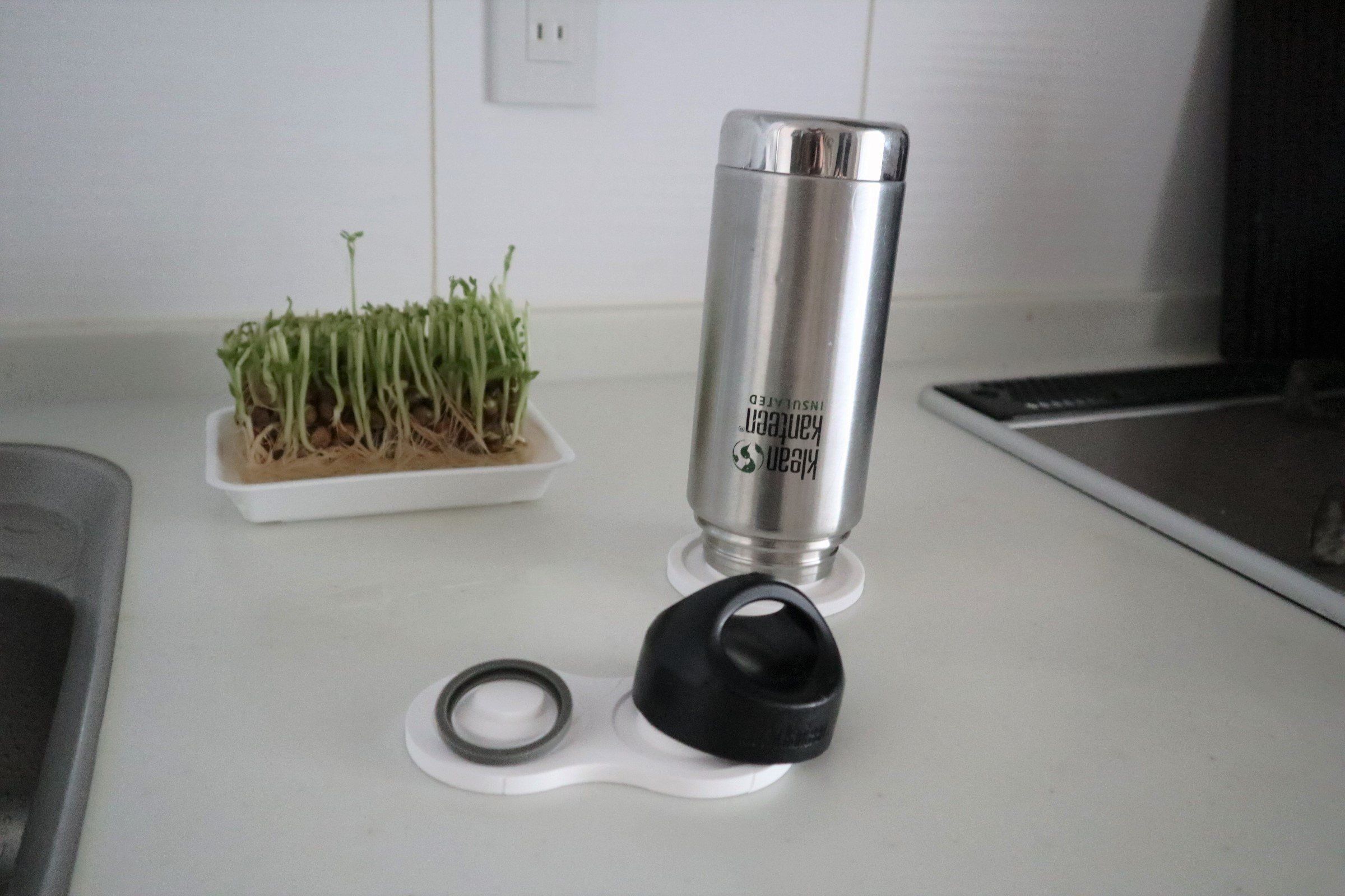 使い方は、写真のように珪藻土の丸い突起部分に、タンブラーや水筒の口を差し込むだけ。蓋などは突起に被せればOKです。突起部分には溝があって、そこに水筒口の縁がハマって安定。高さのあるタンブラーを逆さにおいても倒れることはありません。