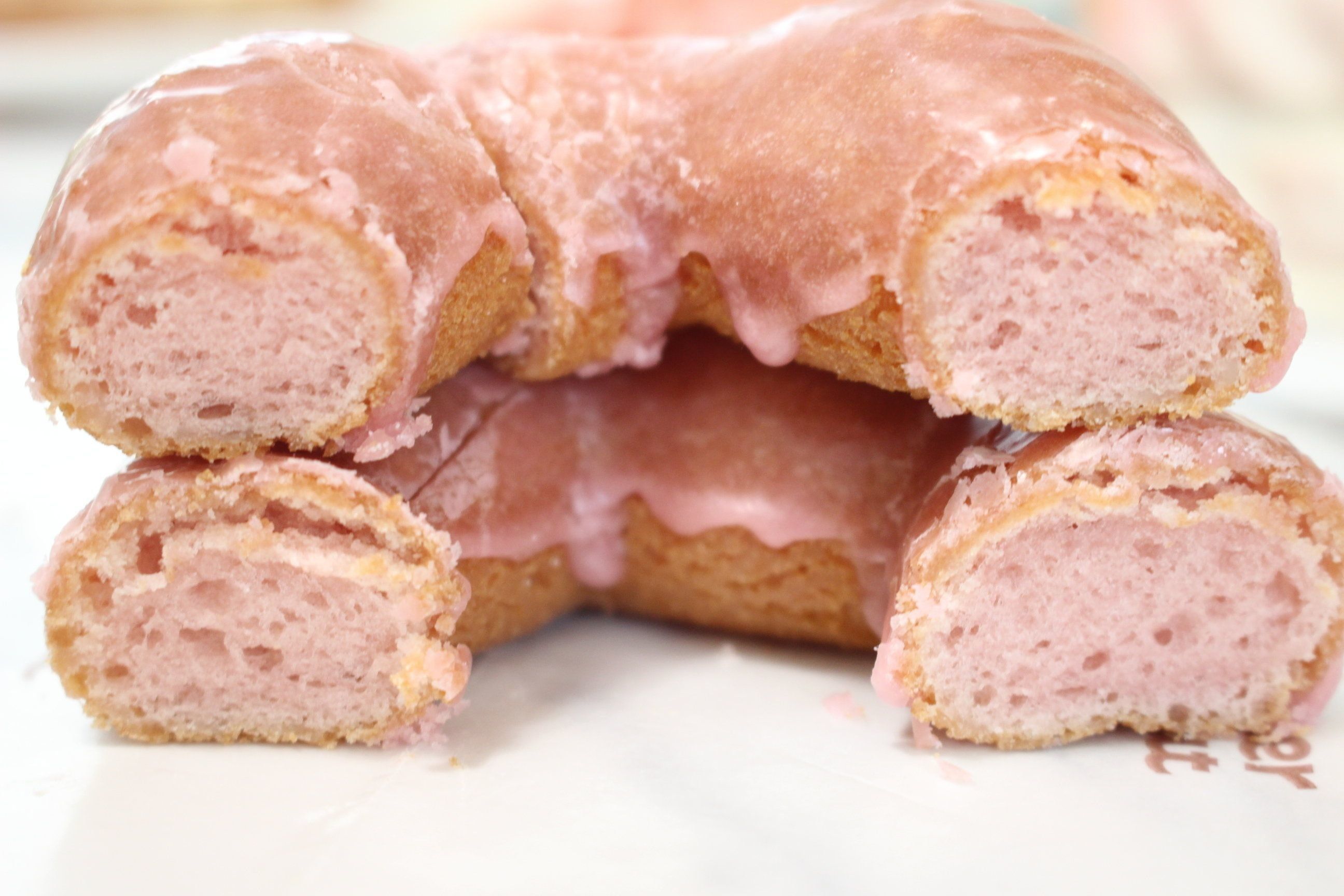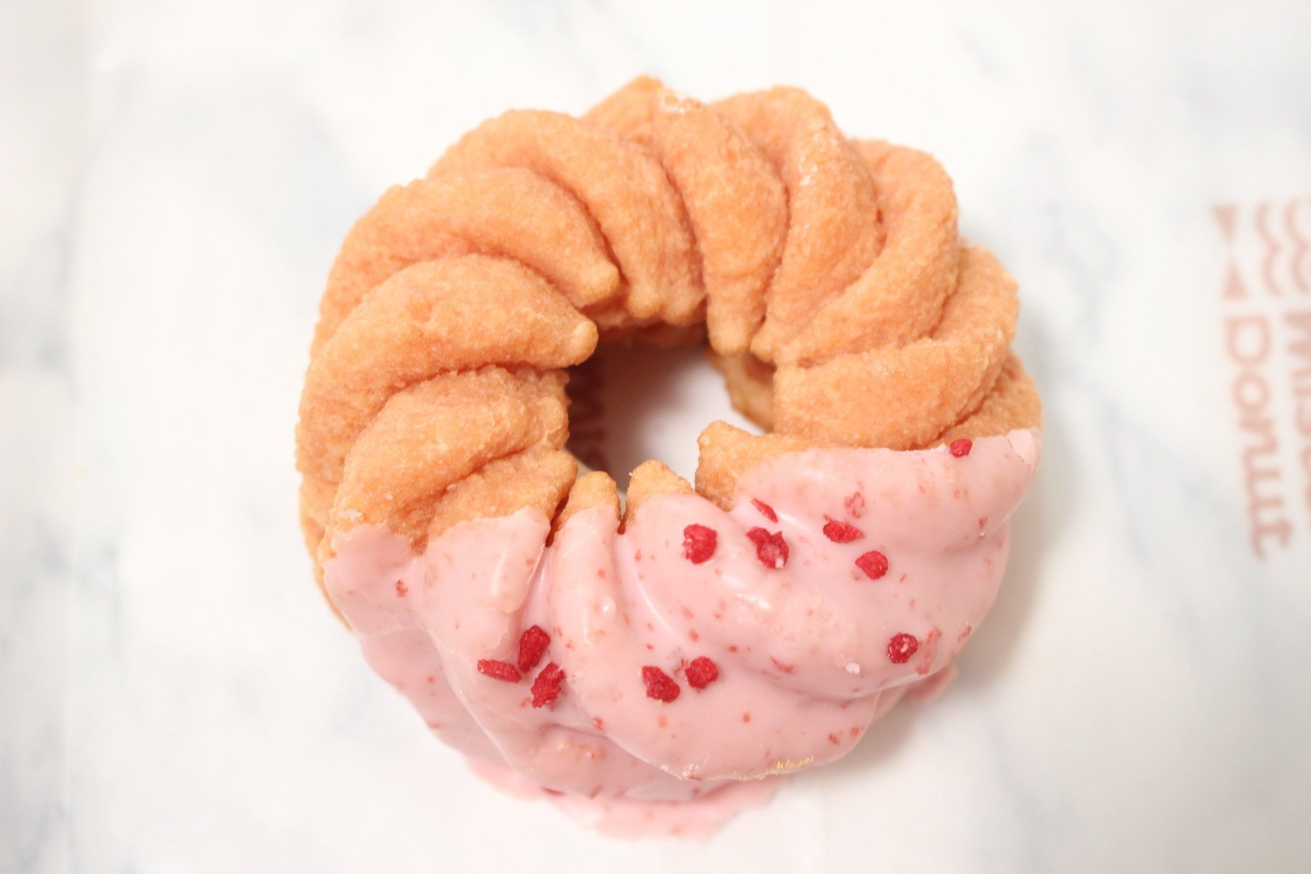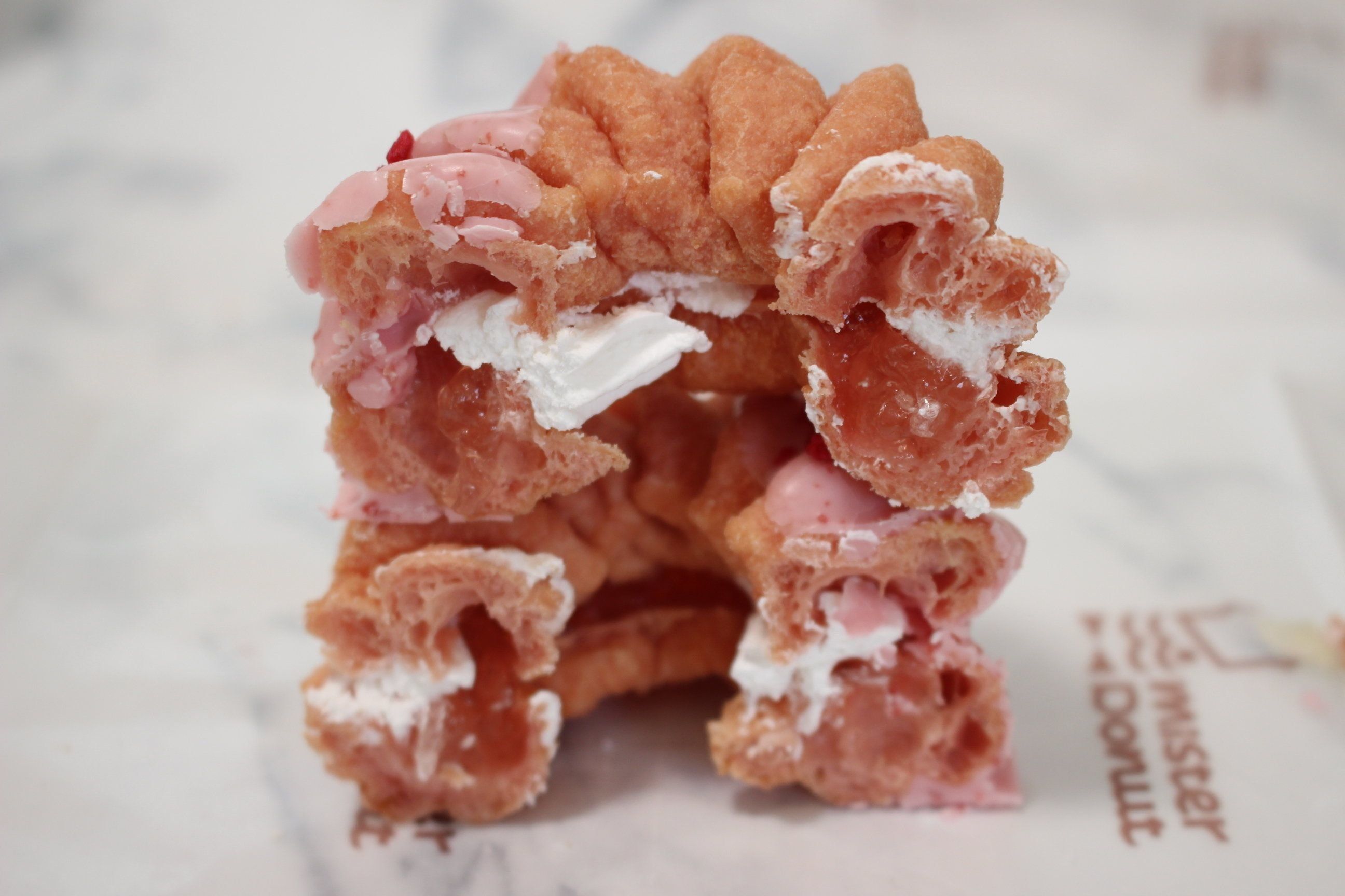 桜色のフレンチクルーラー生地に、はちみつを使用した桜風味ジュレとホイップクリームをサンド。ストロベリーチョコをコーティングしフランボワーズ顆粒をトッピング。