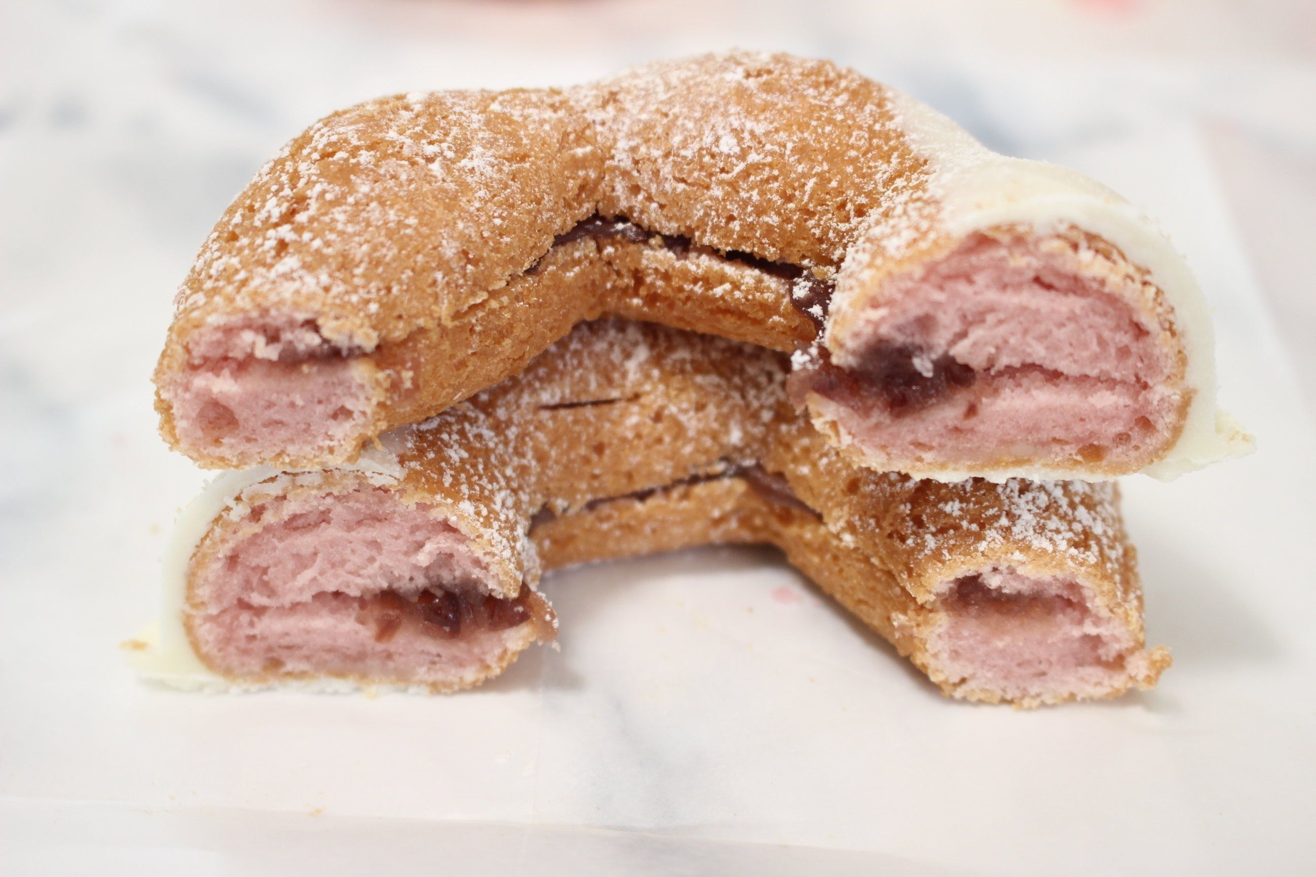 桜色のフレンチクルーラー生地に、粒あんとホイップクリームをサンド。ホワイトチョコとストロベリーチョコで仕上げました。