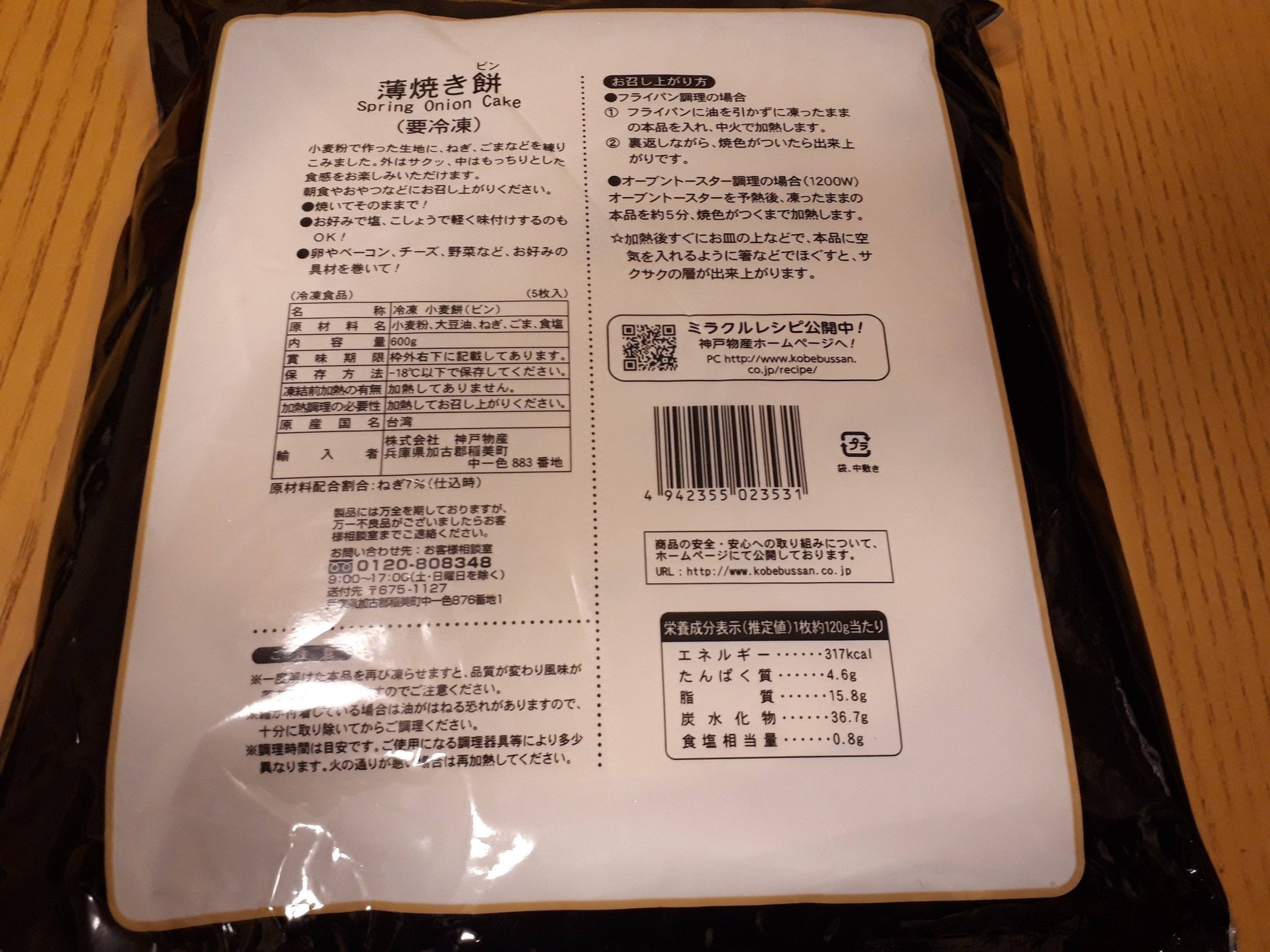 業務スーパーの葱抓餅(薄焼き餅)。何と読むのかな?とネットで読み方を調べたところ、「ツォンジュアビン」と読むのだそうです。5枚入って360円。