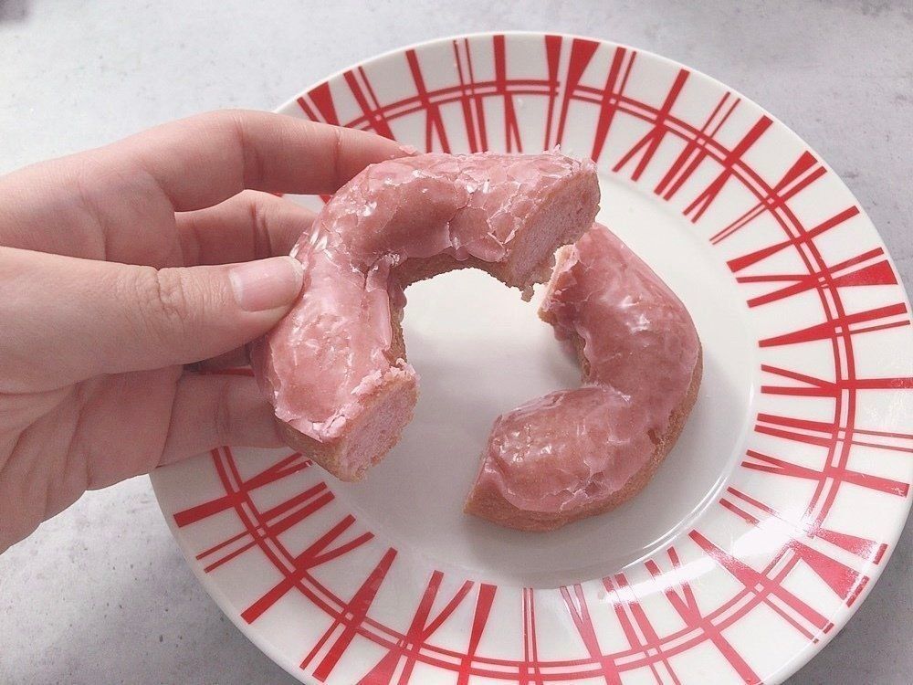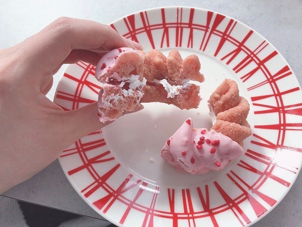 最初に食べた桜もちっとドーナツ 桜フレーバーとは少し違い、生地の中はモッチモチなのに表面はサクサク!1度に2種類の食感が楽しめます♪