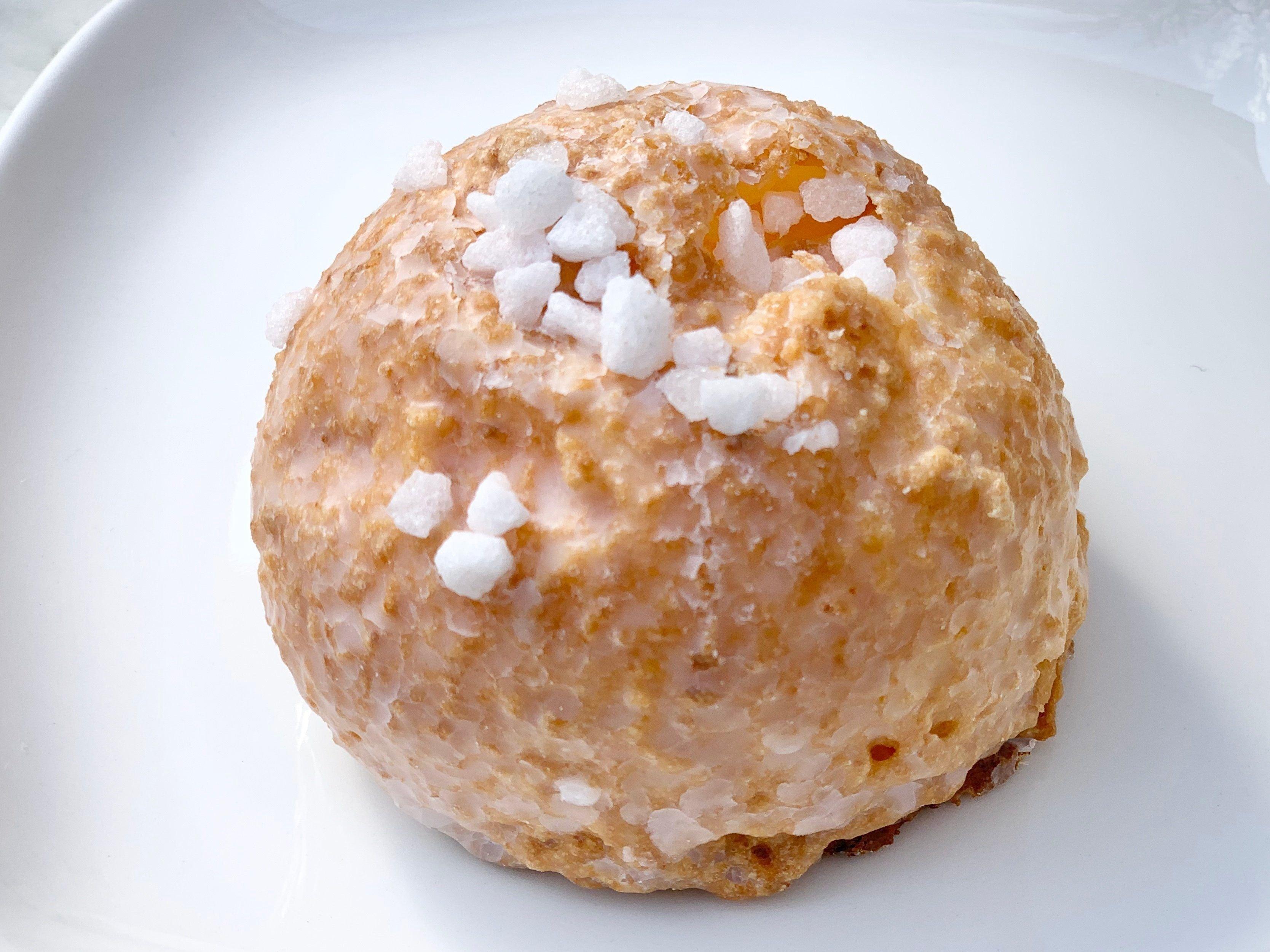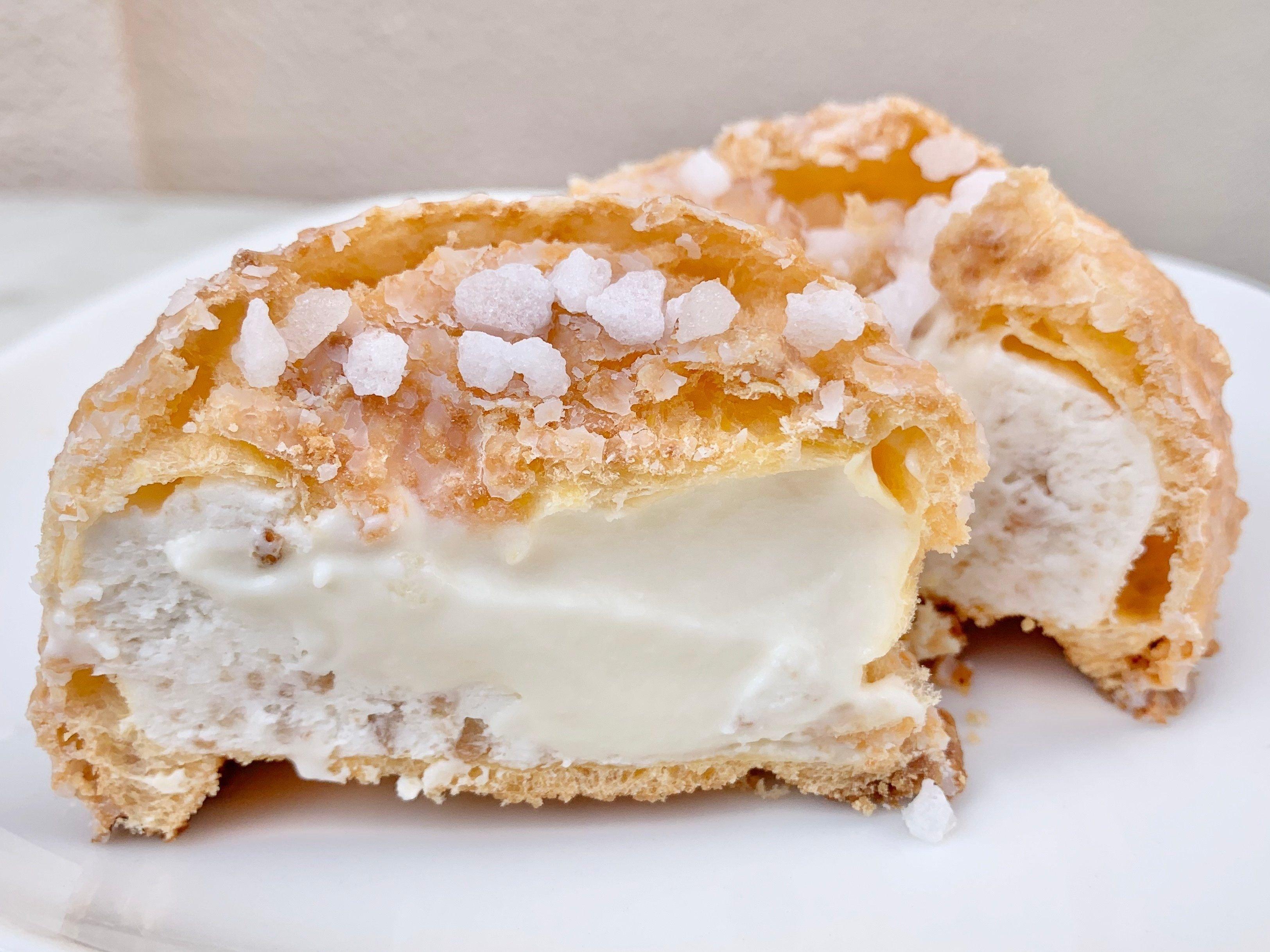クッキー生地とシュー生地を合わせたザクザク食感の生地に、ミルククリームとクッキー入りバニラクリームを詰め込みました。固くて白いパールシュガーをトッピングし、表面にもザクザク食感を加えました。