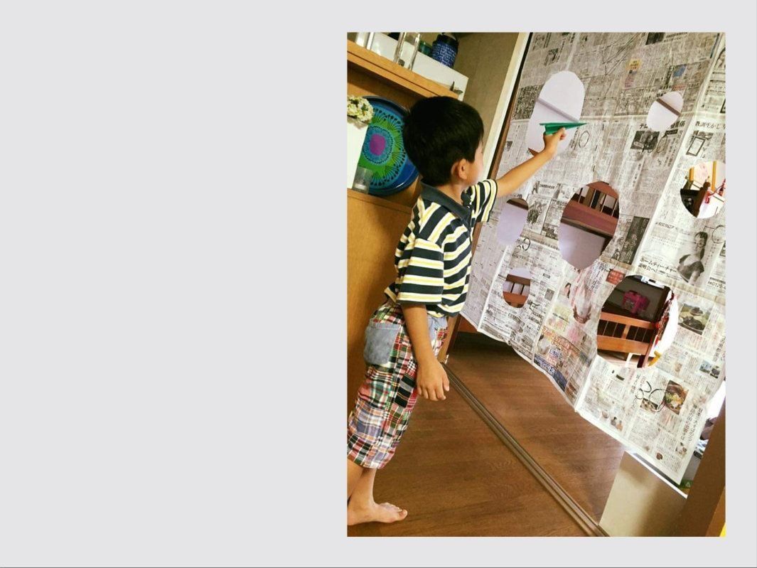 2.新聞紙に◯や△や◻︎や☆など紙飛行機が通り抜けできるサイズの穴を開ける。新聞紙1枚で物足りなければ同じよいに穴を開けたモノを繋げる。的が仕上がったら、桟などから暖簾のように垂らす。