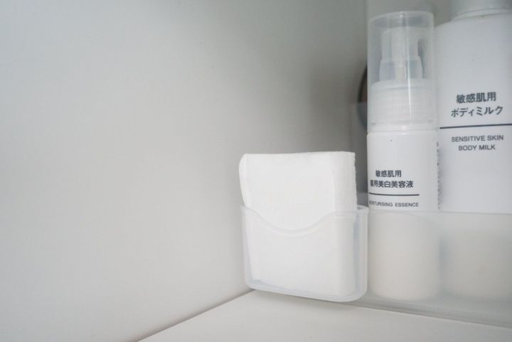 コットンで化粧水などをつけるようになり、洗面所まで取りに行くのも面倒なので、ここでも冷蔵庫ポケットを使って、コットン収納にしました。コットンがちょうどはまり、使いやすくなりました!