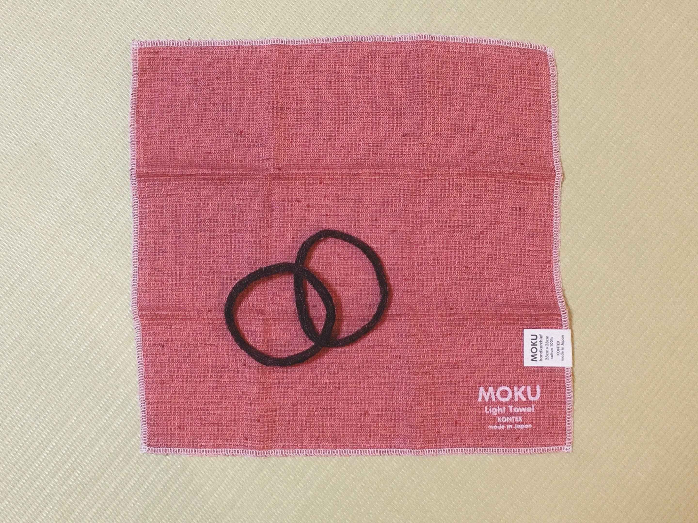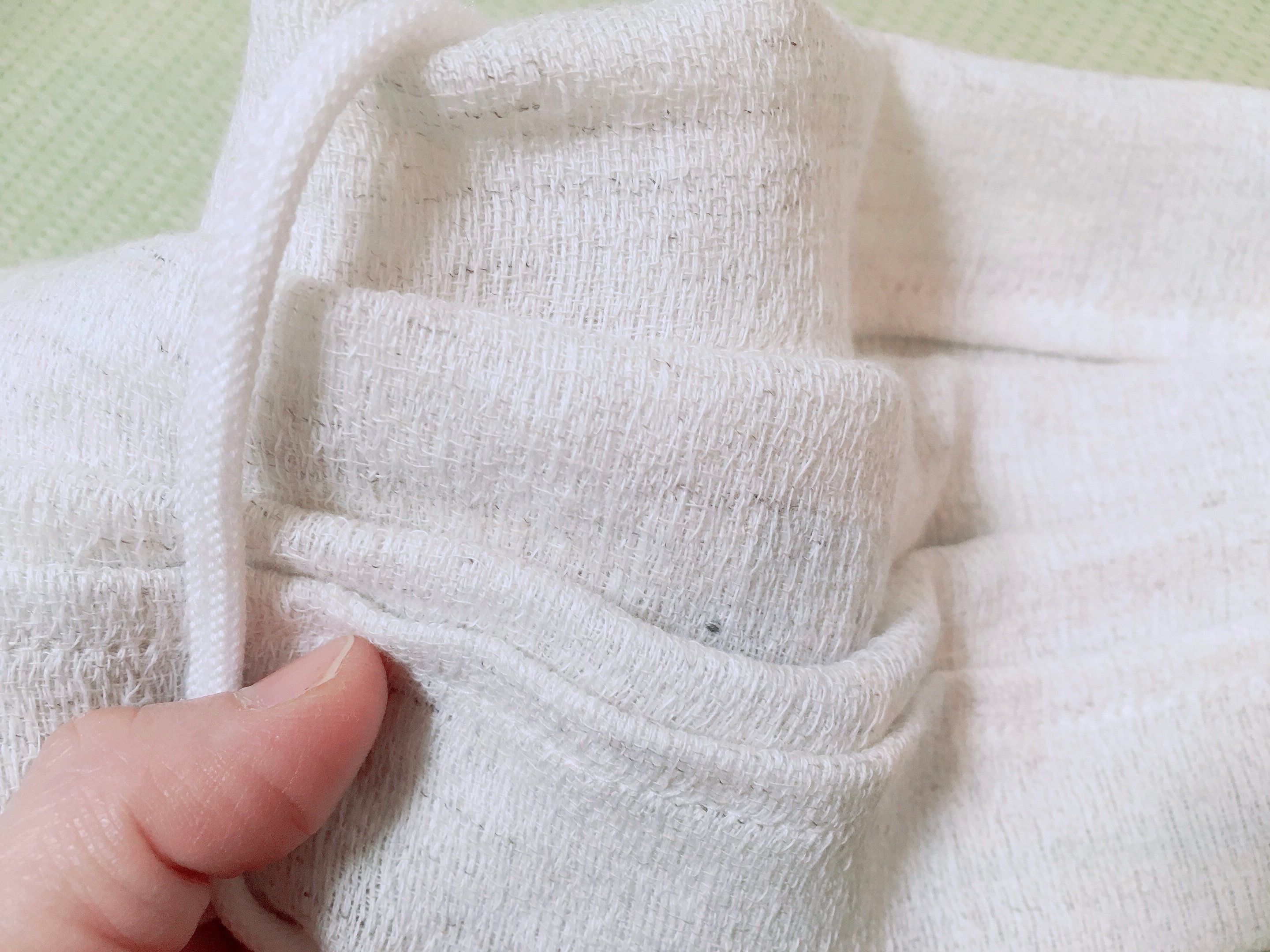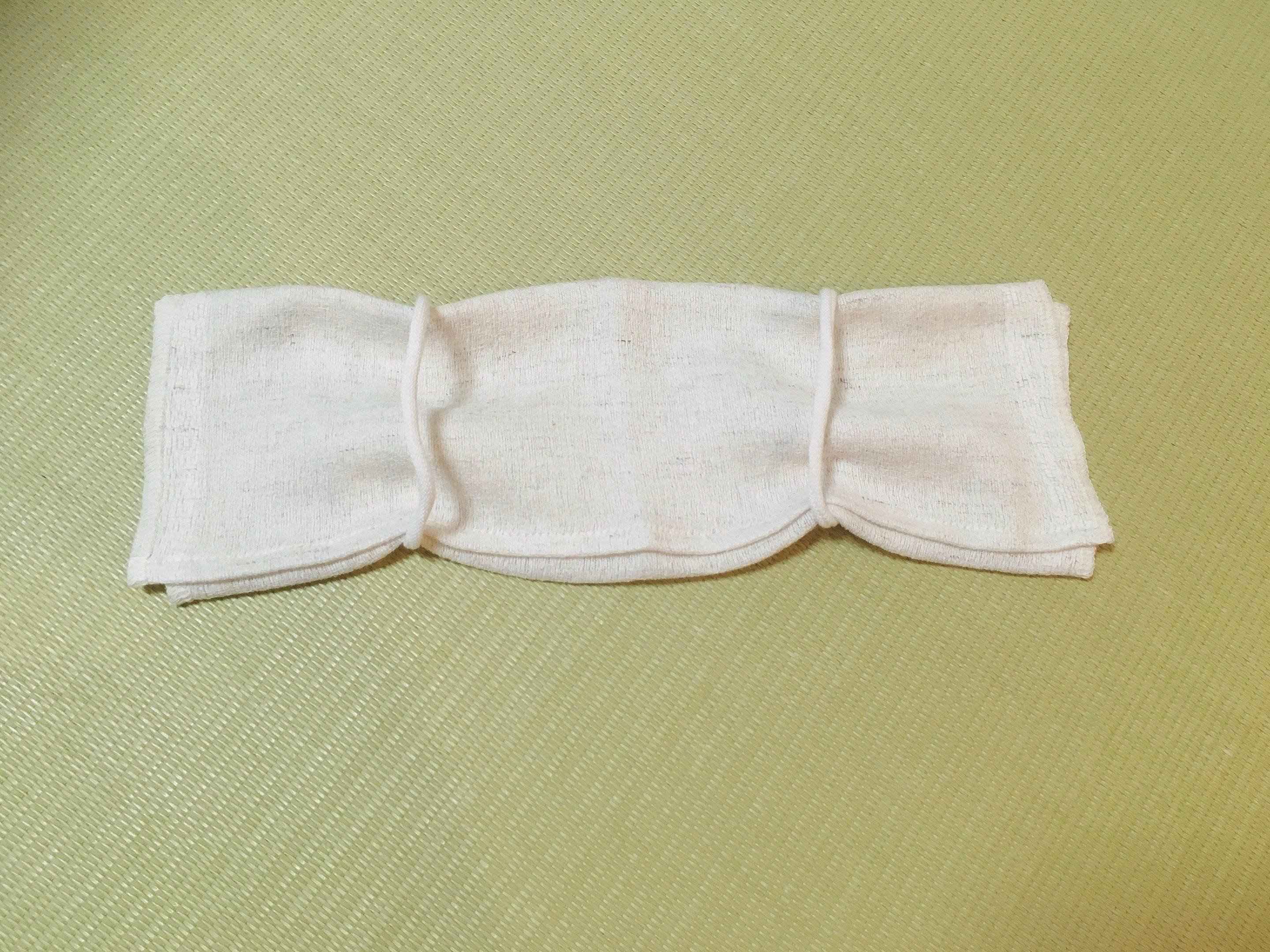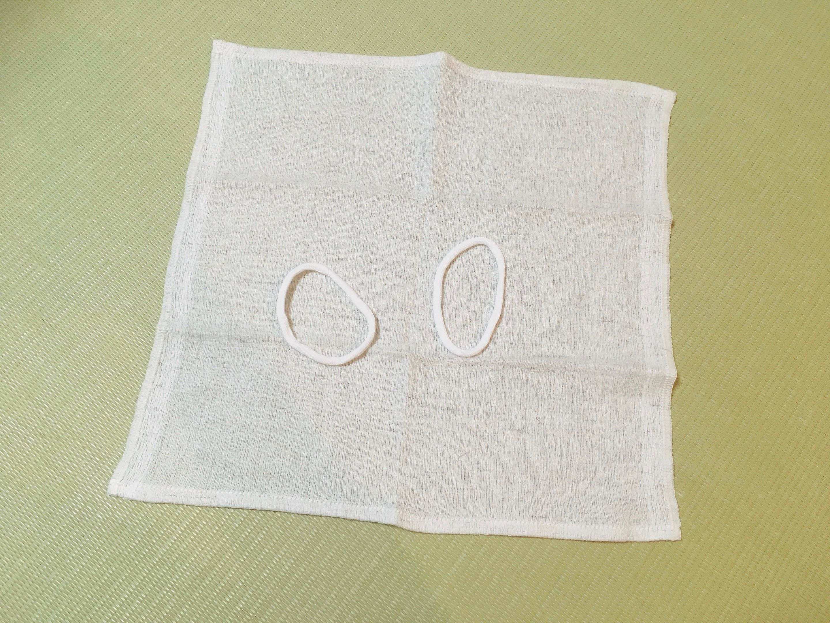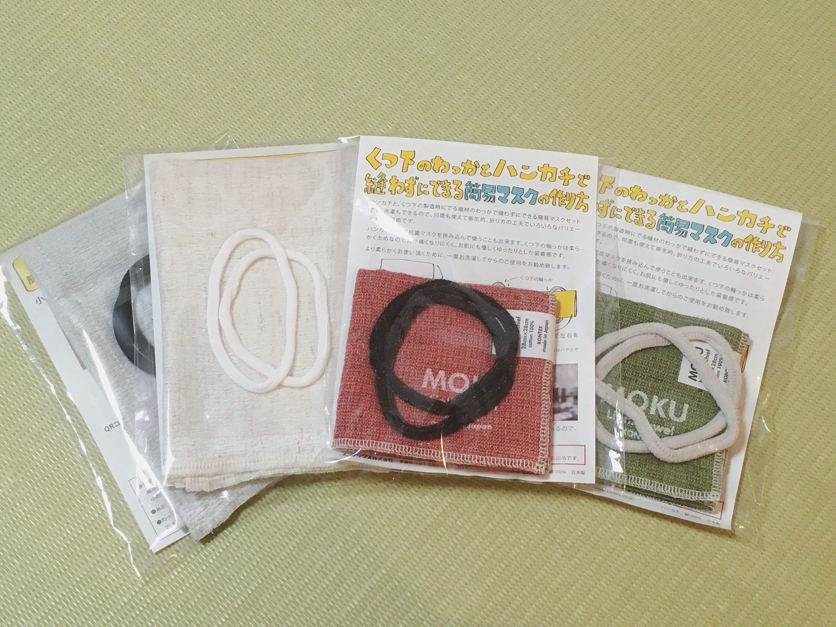 こちらはガーゼハンカチと、靴下を縫製した際に出る端材である、わっかがセットになっています。靴下のわっかがマスクのゴムに使えるとは!でもたしかに伸縮性はあるし、素材も柔らかい。