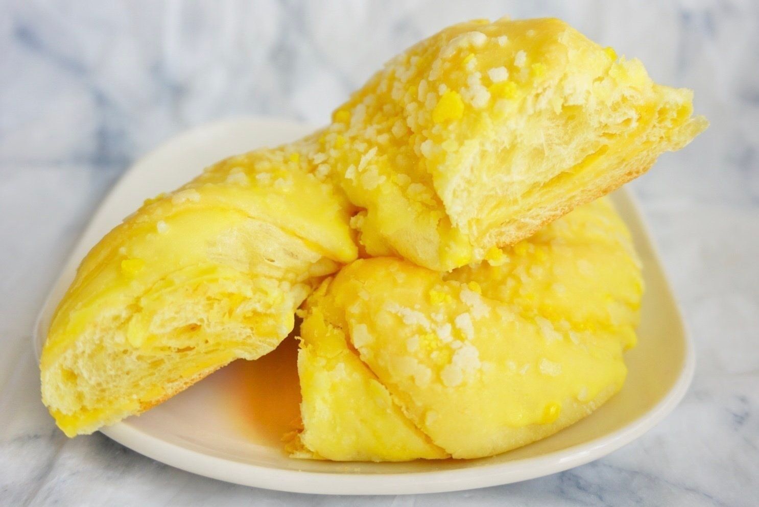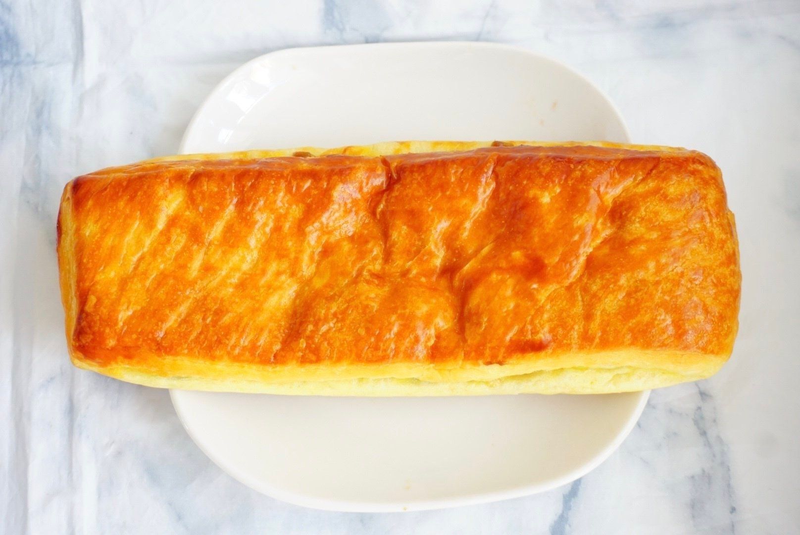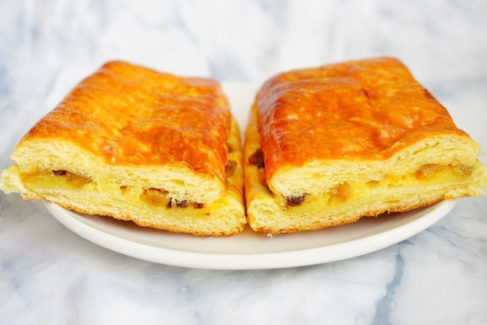 デニッシュ生地にバナナカスタードクリームとチョコチップ、バナナ果肉をはさんで焼き上げた一品。
