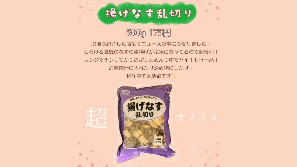 意外と手間がかかる揚げなすが冷凍になっているので、とても便利です。なすは油と相性がよく揚げると旨味が増すのですが、冷凍でもしっかりおいしさが詰まってます。揚げなすなので、このまま調理に使っても色が鮮やかでとってもきれい。お味噌汁に入れるのもおすすめですよ。