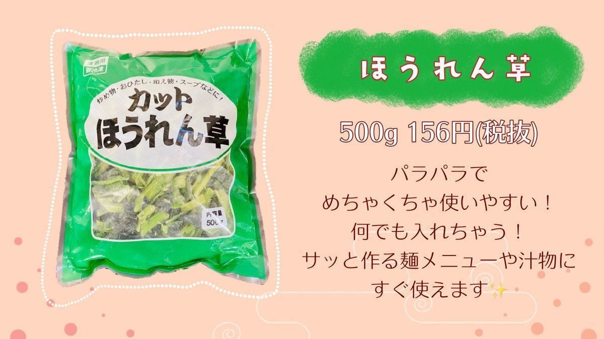 あらかじめカットしてあるほうれん草がパラパラの状態で凍結されてます。汁物、炒め物、麺類など、ちょっと足すのにとても便利。ほうれん草をゆでるのって意外と面倒なので、本当に助かる商品です。