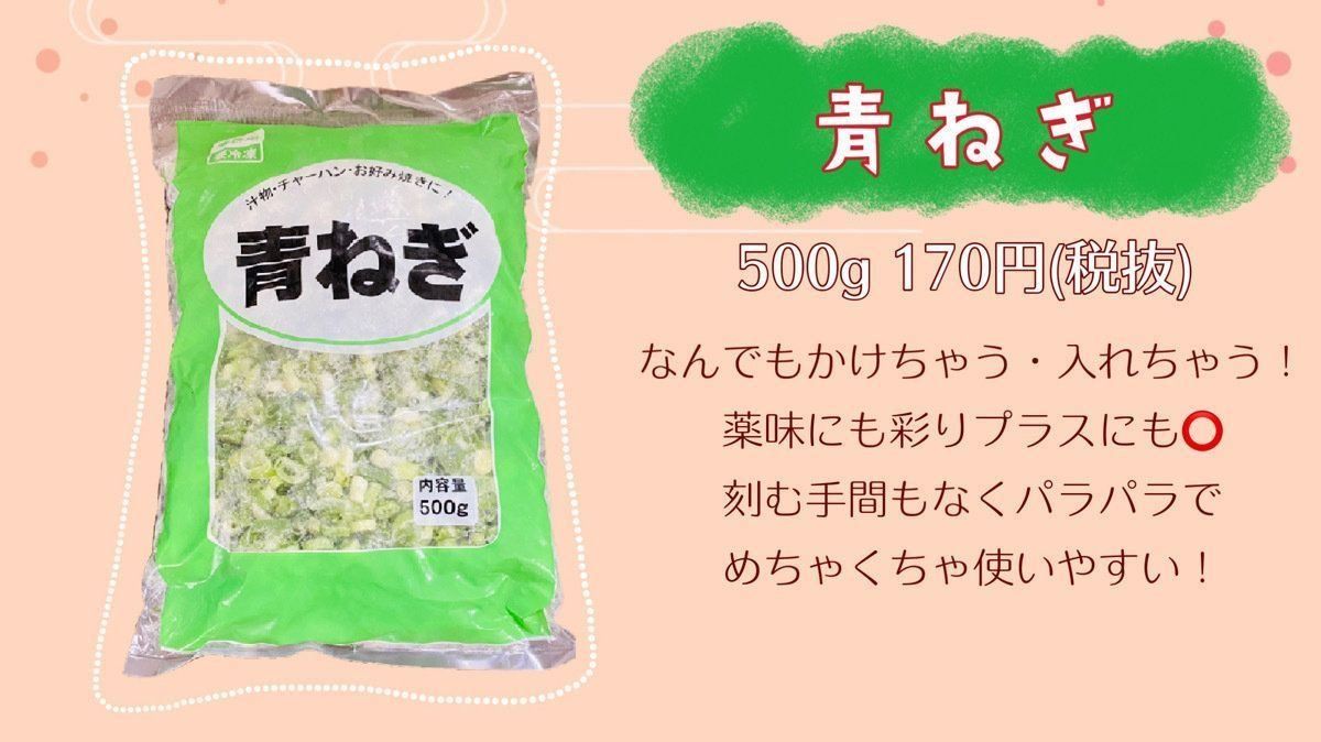 薬味としてパパッと使えるので便利です。刻む手間が面倒でな青ねぎも、500gでこの価格なので迷わずねぎだくにできちゃいます!業務スーパーの冷凍野菜には青ねぎのほかに白ねぎもありますが、私は彩りも兼ねたいので青ねぎを常備しています。