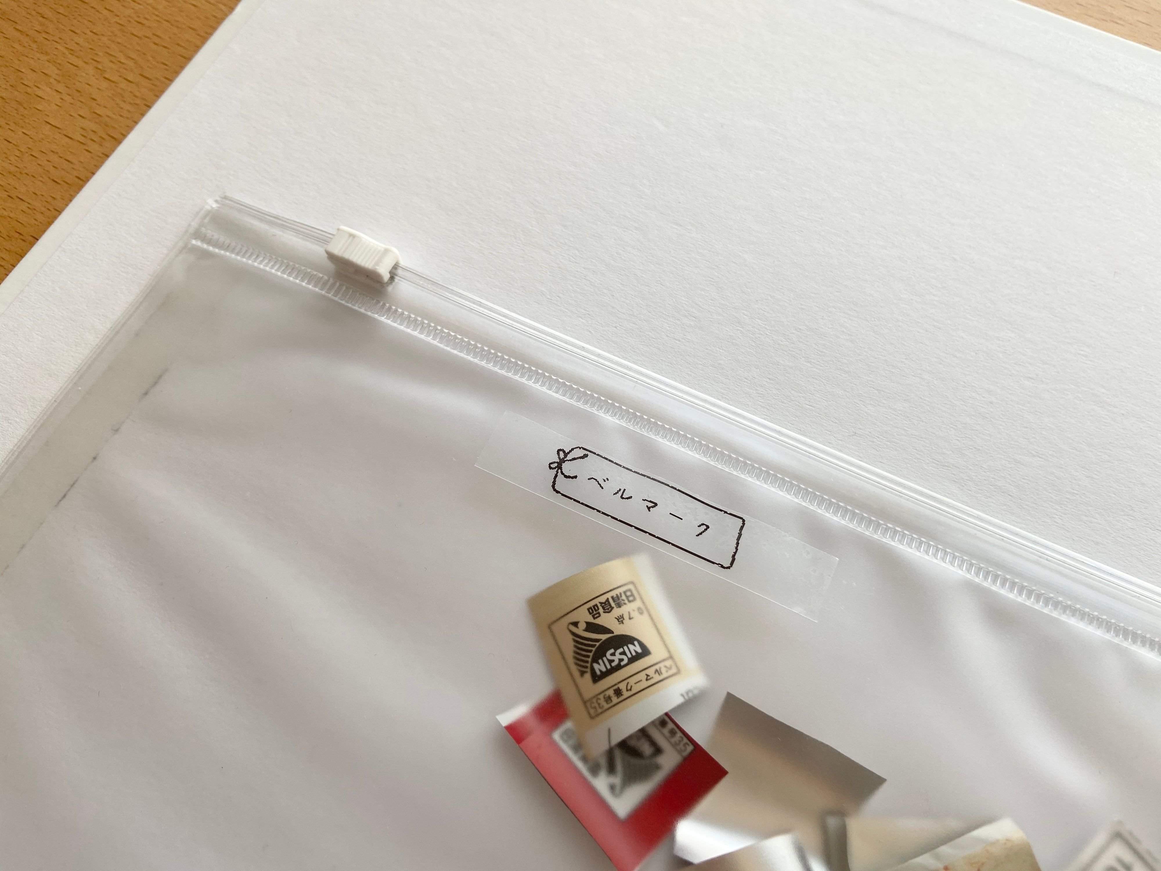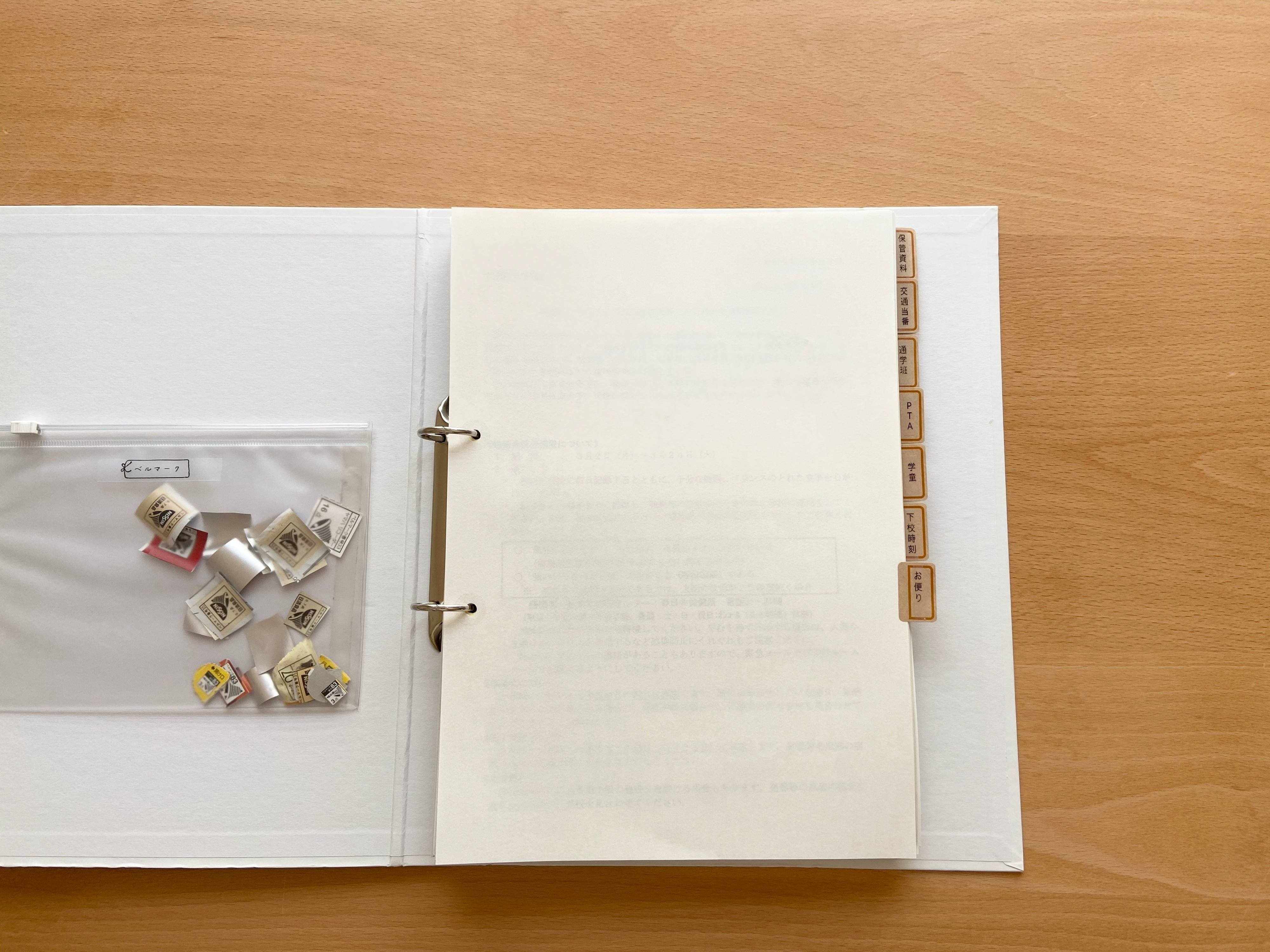 学校に提出するようなベルマークなどはファイルにポケットを貼って集めておくと便利です。家にあったファスナーケースを両面テープで貼ってポケットにしています。最近は100円ショップで貼り付け用のポケットが色々販売されているので、収集したいものや、ファイルとは別管理したいものがあれば、用途に合わせてぴったりものを探してくるのも良いと思います。