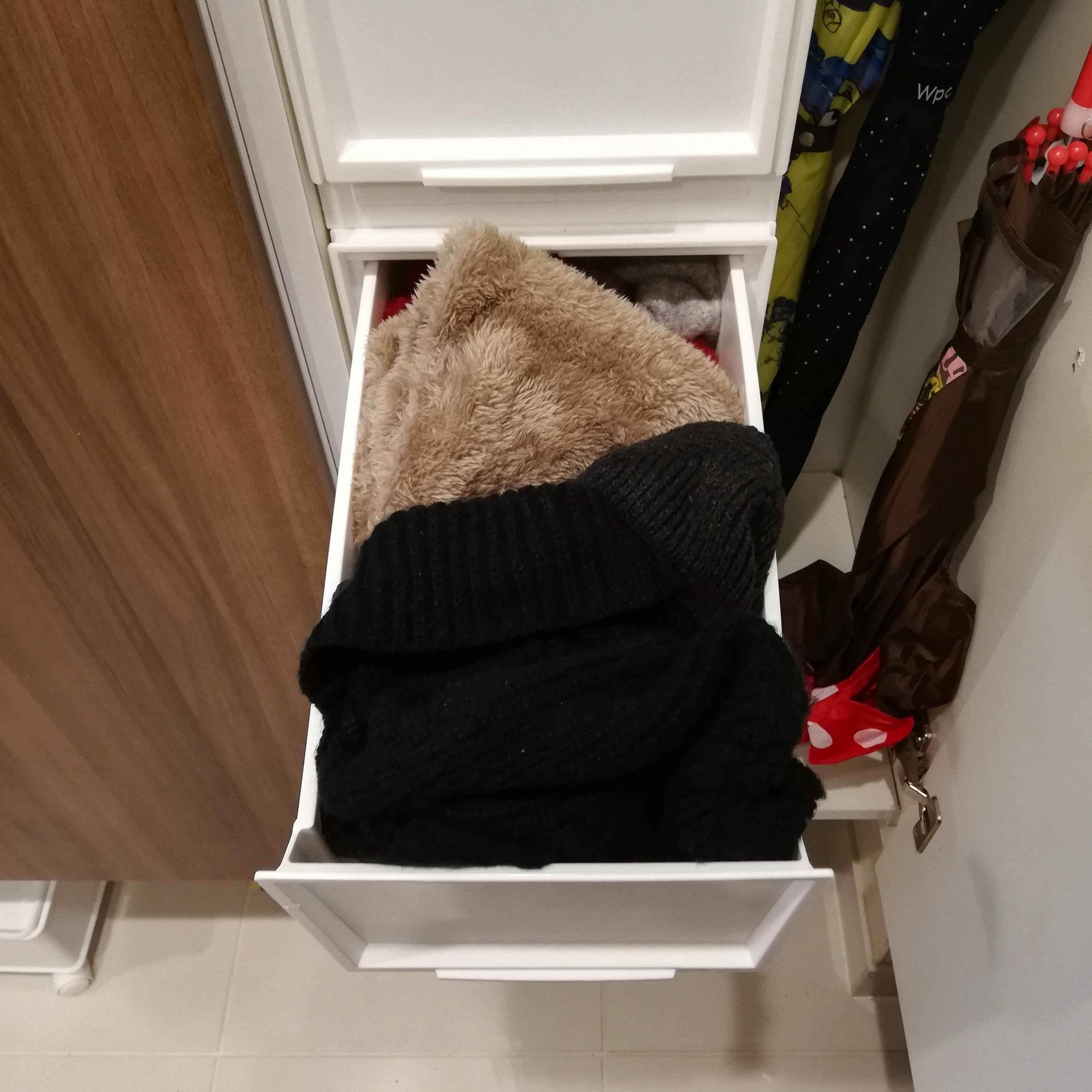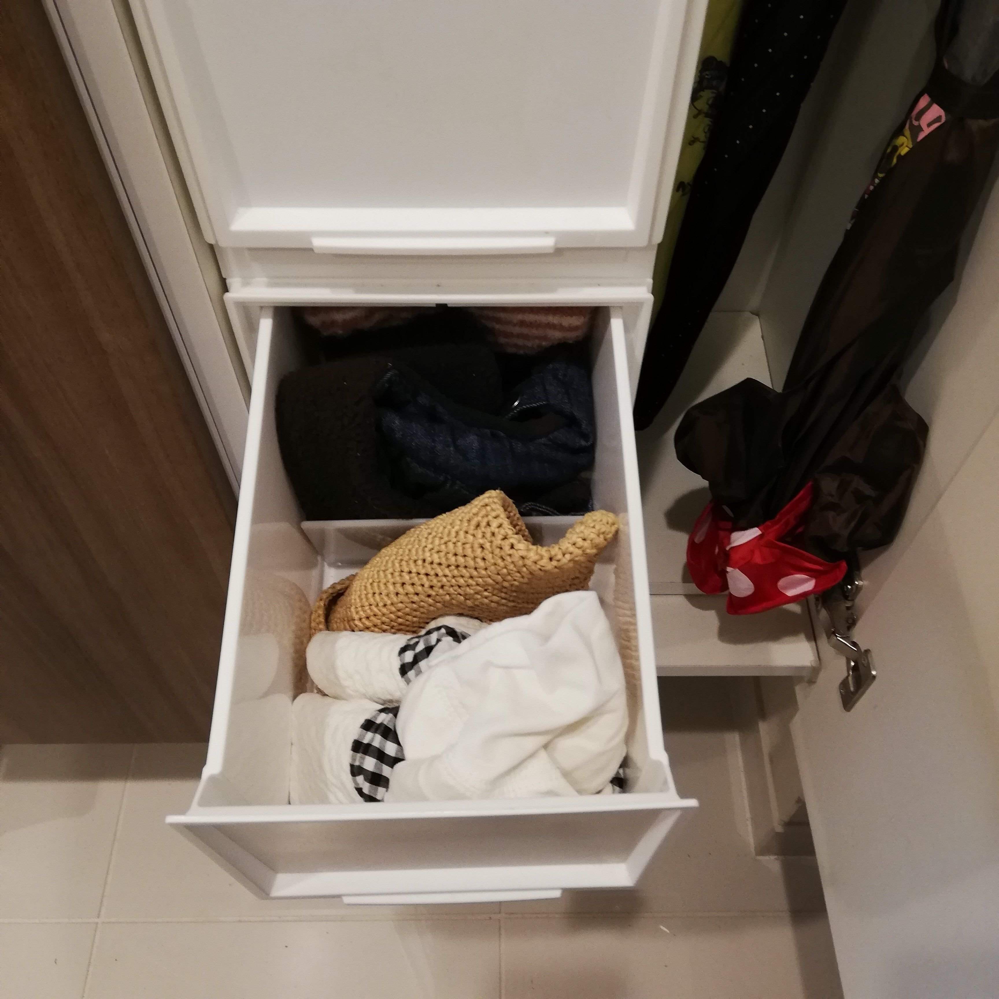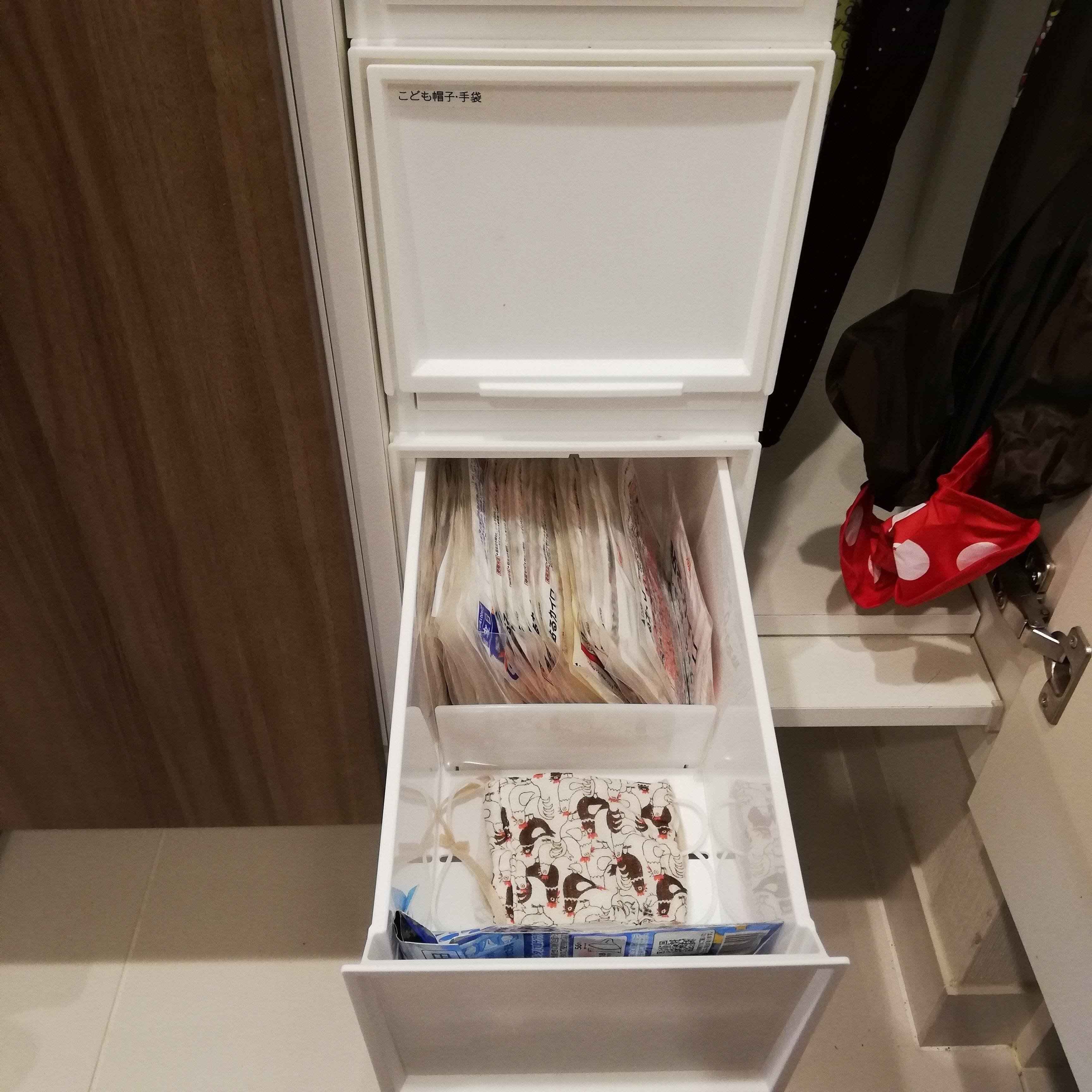 ここには、折り畳める帽子や手袋など外出時に忘れそうな子どもの小物を収納しています。