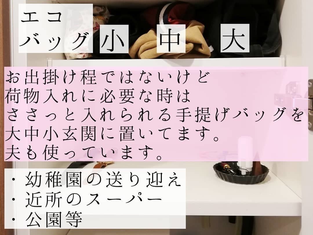 ファイルボックスの下の隙間収納には、エコバッグ+大中小の手提げを収納しています。