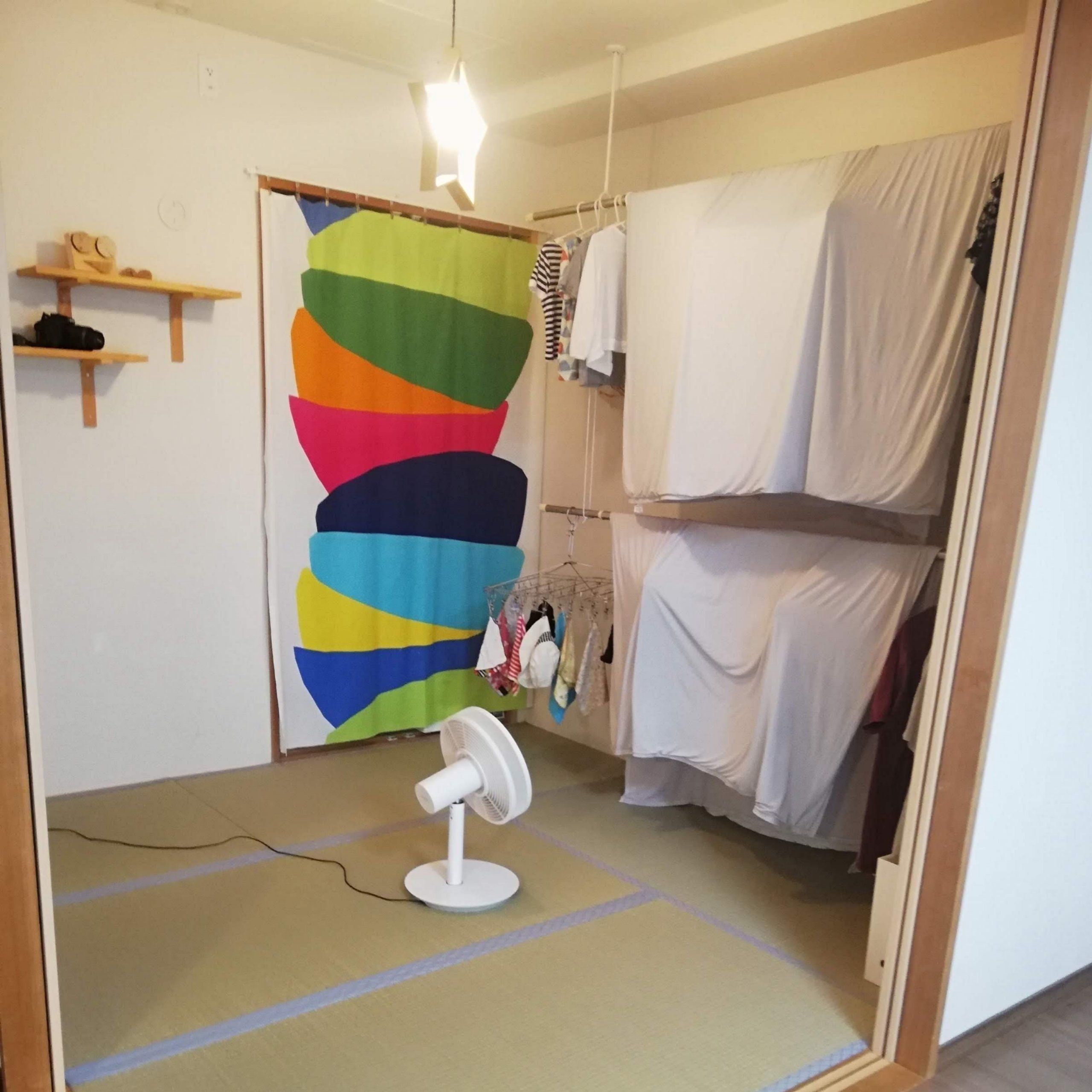 元々ある室内干しスペースに、ブランコ式にしてスペースを2倍にしました。軽い子供服やシーツであれば下段にもかけられます。耐荷重を越えそうな場合は浴室に干しています。